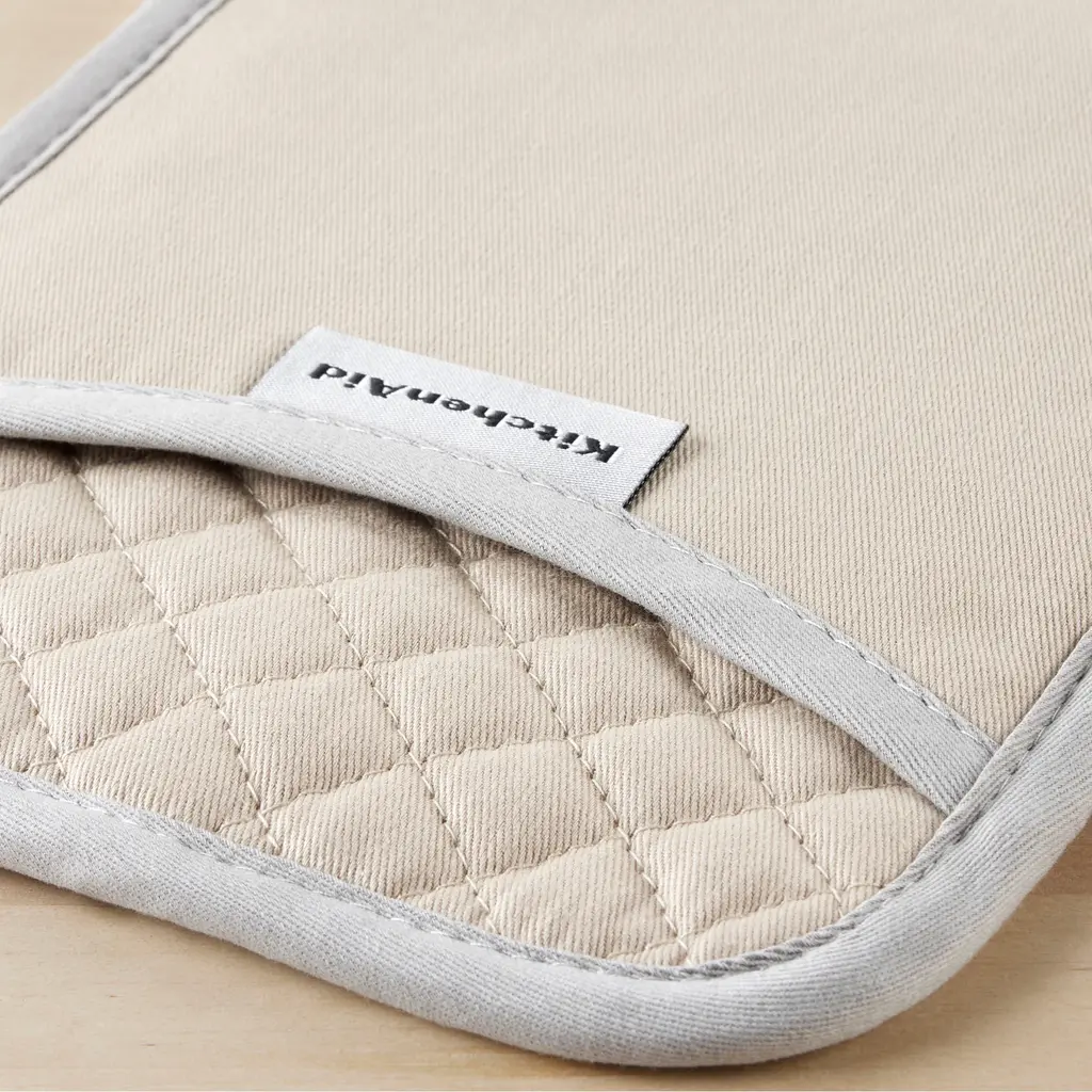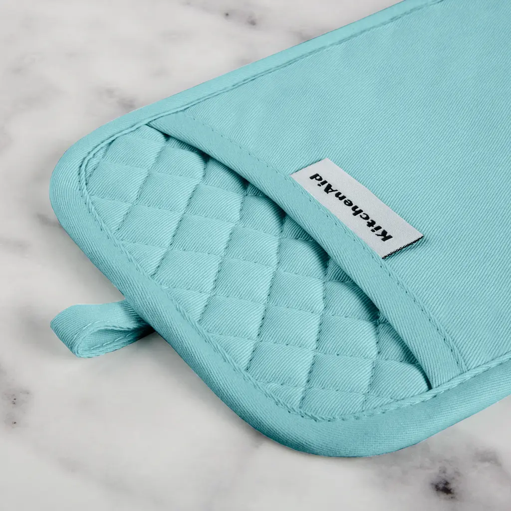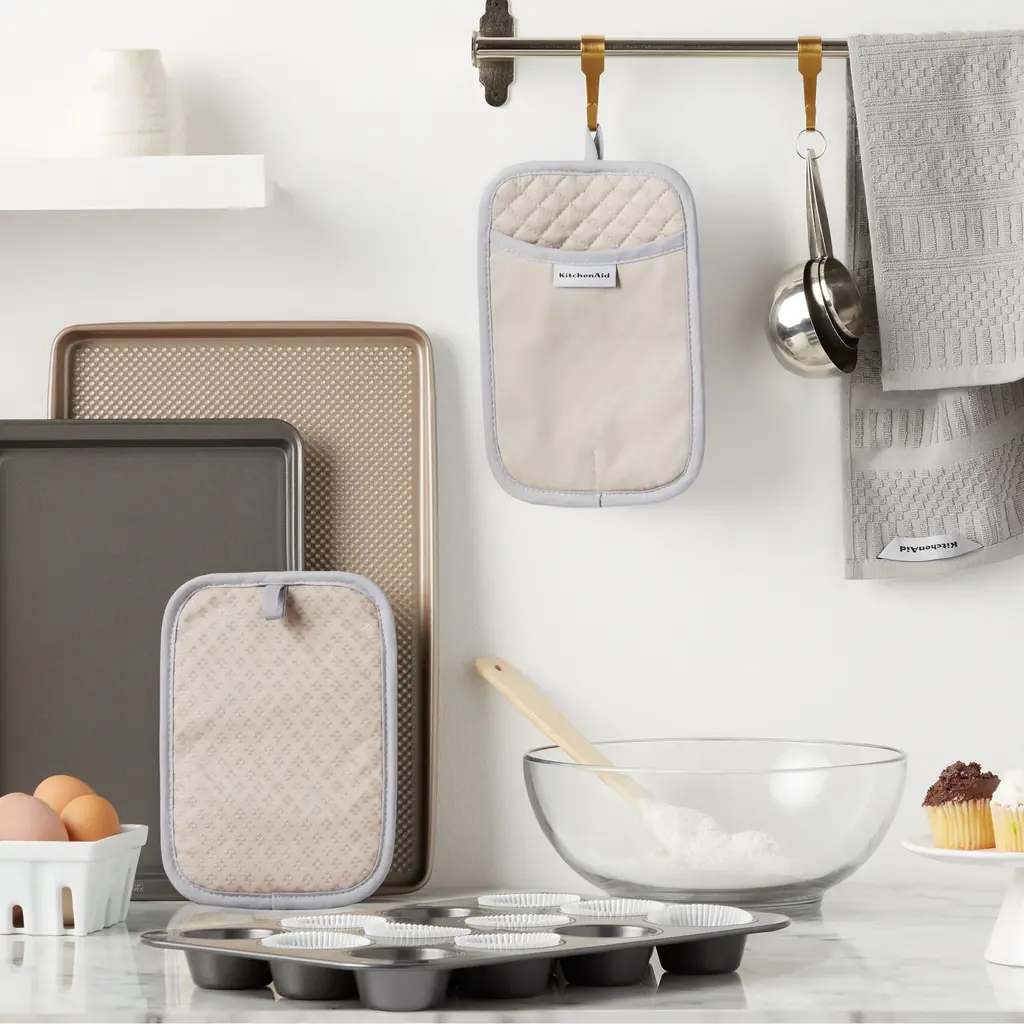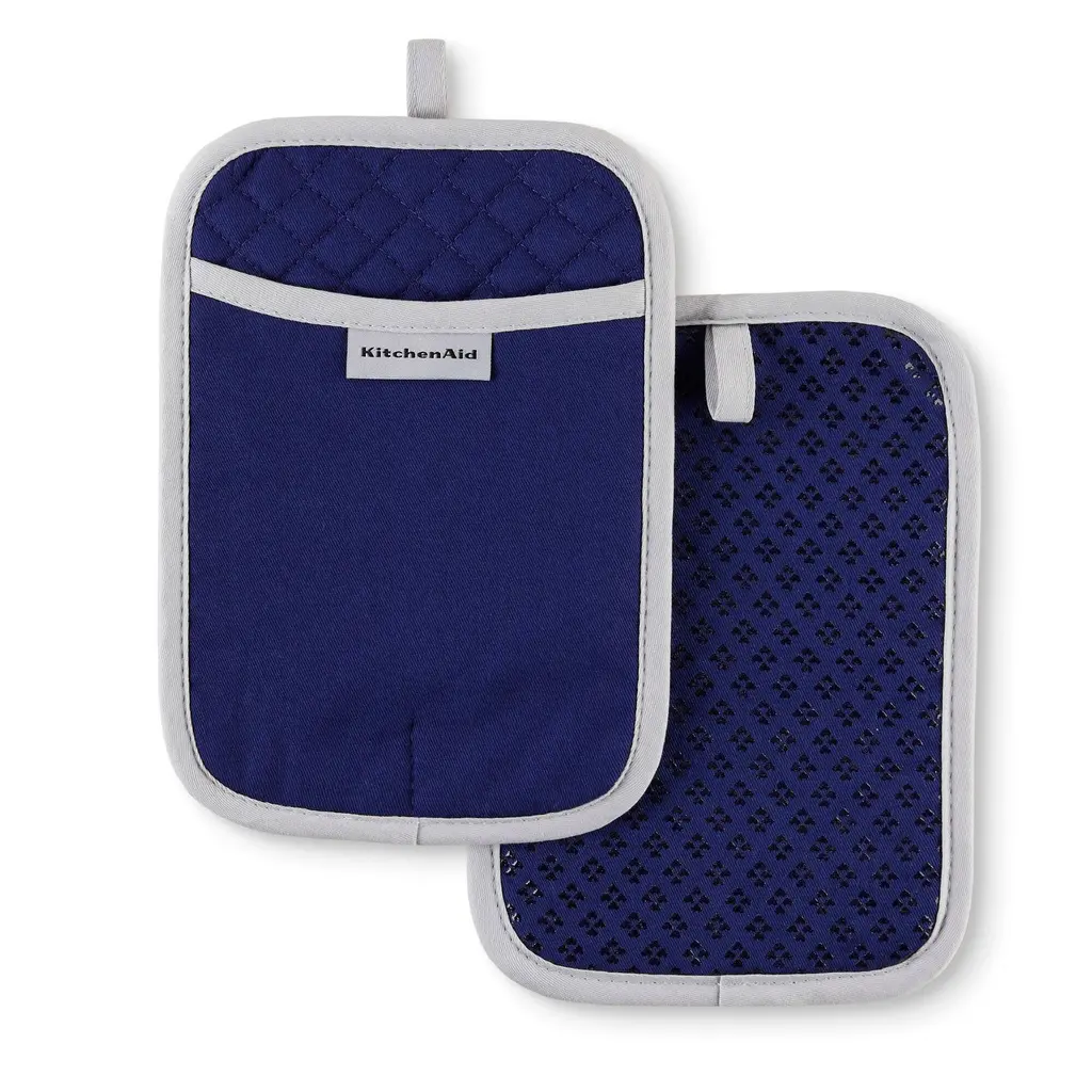 Use the KitchenAid Asteroid Pot Holders 2 Pack to protect hands from the heat when handling hot pots, pans, and dishes. These rectangle pot holders each measure 7 inches wide by 10 inches long and feature a slide pocket for your hand for easy on and off use while you're cooking and baking. The heavy-duty, 100 percent cotton fabric offers comfort, flexibility, and insulation. Textured, silicone print grips on the pot holders are heat resistant and also ensure a more firm and secure grip when handling hot cookware. The matching pot holders feature a convenient hanging loop to easily display or store them when not in use. They are easy to clean and machine washable for easy care. Use your KitchenAid Asteroid Pot Holders 2 Pack along with coordinating kitchen accessories from KitchenAid including oven mitts and kitchen towels for a complete set of KitchenAid kitchen essentials! Each item is sold separately. Made in China.