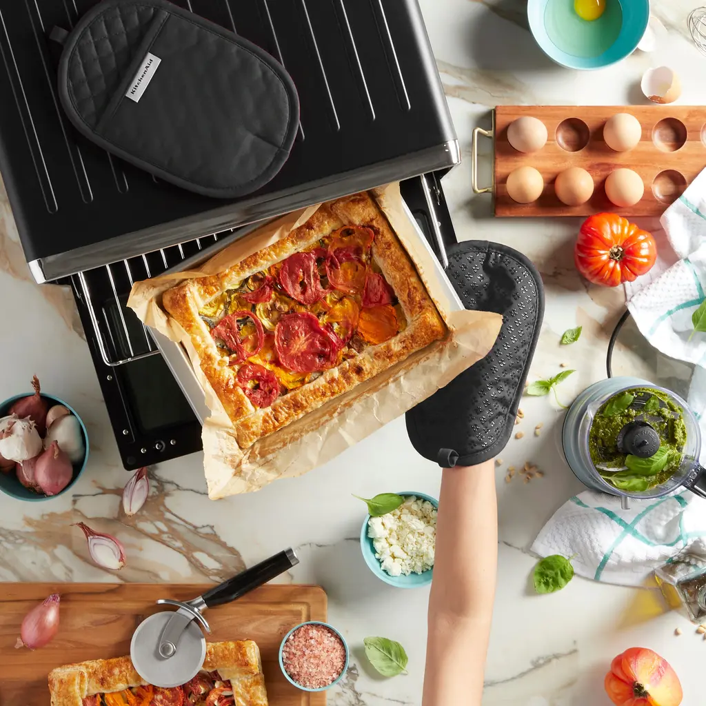 Use the Kitchen Aid Asteroid Pot Holders 2 Pack to protect hands from the heat when handling hot pots, pans, and dishes. These oval pot holders each measure 6.5 inches wide by 10 inches long and feature a slide pocket for your hand for easy on and off use while you're cooking and baking. The heavy-duty, 100 percent cotton fabric offers comfort, flexibility, and insulation. Textured, silicone print grips on the pot holders are heat resistant and also ensure a more firm and secure grip when handling hot cookware. The matching pot holders feature a convenient hanging loop to easily display or store them when not in use. They are easy to clean and machine washable for easy care. Use your Kitchen Aid Asteroid Pot Holders 2 Pack along with coordinating kitchen accessories from Kitchen Aid including oven mitts and kitchen towels for a complete set of Kitchen Aid kitchen essentials! Each item is sold separately. Made in China.