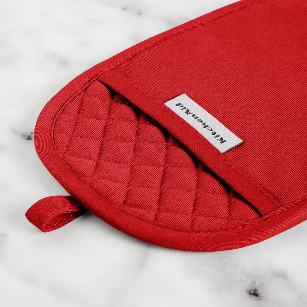 Use the Kitchen Aid Asteroid Pot Holders 2 Pack to protect hands from the heat when handling hot pots, pans, and dishes. These oval pot holders each measure 6.5 inches wide by 10 inches long and feature a slide pocket for your hand for easy on and off use while you're cooking and baking. The heavy-duty, 100 percent cotton fabric offers comfort, flexibility, and insulation. Textured, silicone print grips on the pot holders are heat resistant and also ensure a more firm and secure grip when handling hot cookware. The matching pot holders feature a convenient hanging loop to easily display or store them when not in use. They are easy to clean and machine washable for easy care. Use your Kitchen Aid Asteroid Pot Holders 2 Pack along with coordinating kitchen accessories from Kitchen Aid including oven mitts and kitchen towels for a complete set of Kitchen Aid kitchen essentials! Each item is sold separately. Made in China.