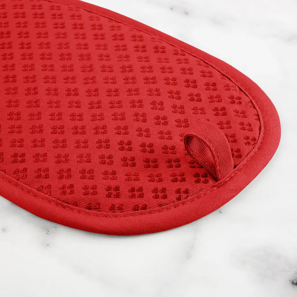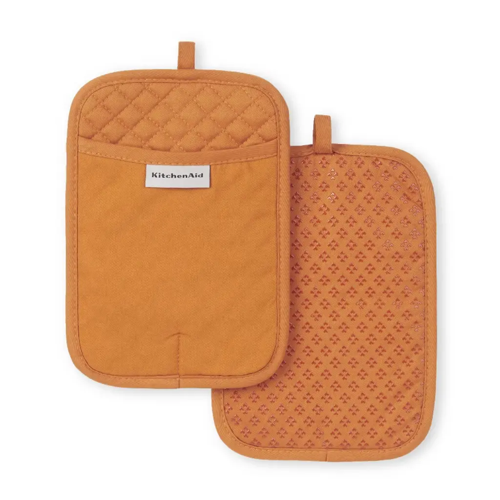 Use the Kitchen Aid Asteroid Pot Holders 2 Pack to protect hands from the heat when handling hot pots, pans, and dishes. These oval pot holders each measure 6.5 inches wide by 10 inches long and feature a slide pocket for your hand for easy on and off use while you're cooking and baking. The heavy-duty, 100 percent cotton fabric offers comfort, flexibility, and insulation. Textured, silicone print grips on the pot holders are heat resistant and also ensure a more firm and secure grip when handling hot cookware. The matching pot holders feature a convenient hanging loop to easily display or store them when not in use. They are easy to clean and machine washable for easy care. Use your Kitchen Aid Asteroid Pot Holders 2 Pack along with coordinating kitchen accessories from Kitchen Aid including oven mitts and kitchen towels for a complete set of Kitchen Aid kitchen essentials! Each item is sold separately. Made in China.