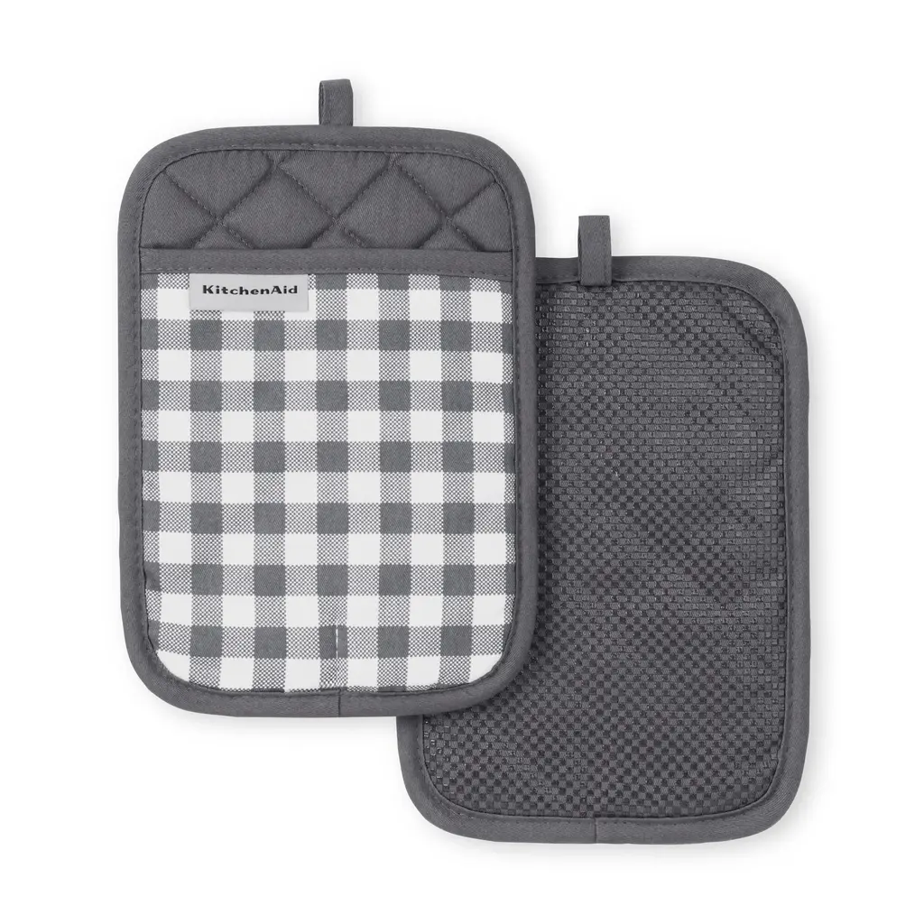 Protect your hands from hot pots and pans with the KitchenAid Gingham 2-Piece Pot Holder Set in Aqua Sky. Each generously sized pot holder measures 7 inches wide by 10 inches and features a classic checkered print pattern. Made of 100% cotton that offers comfort and insulation, these pot holders are heat resistant and feature printed silicone for a more secure grip. This set is machine washable for easy care.