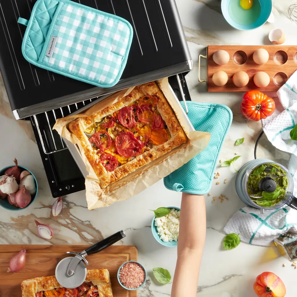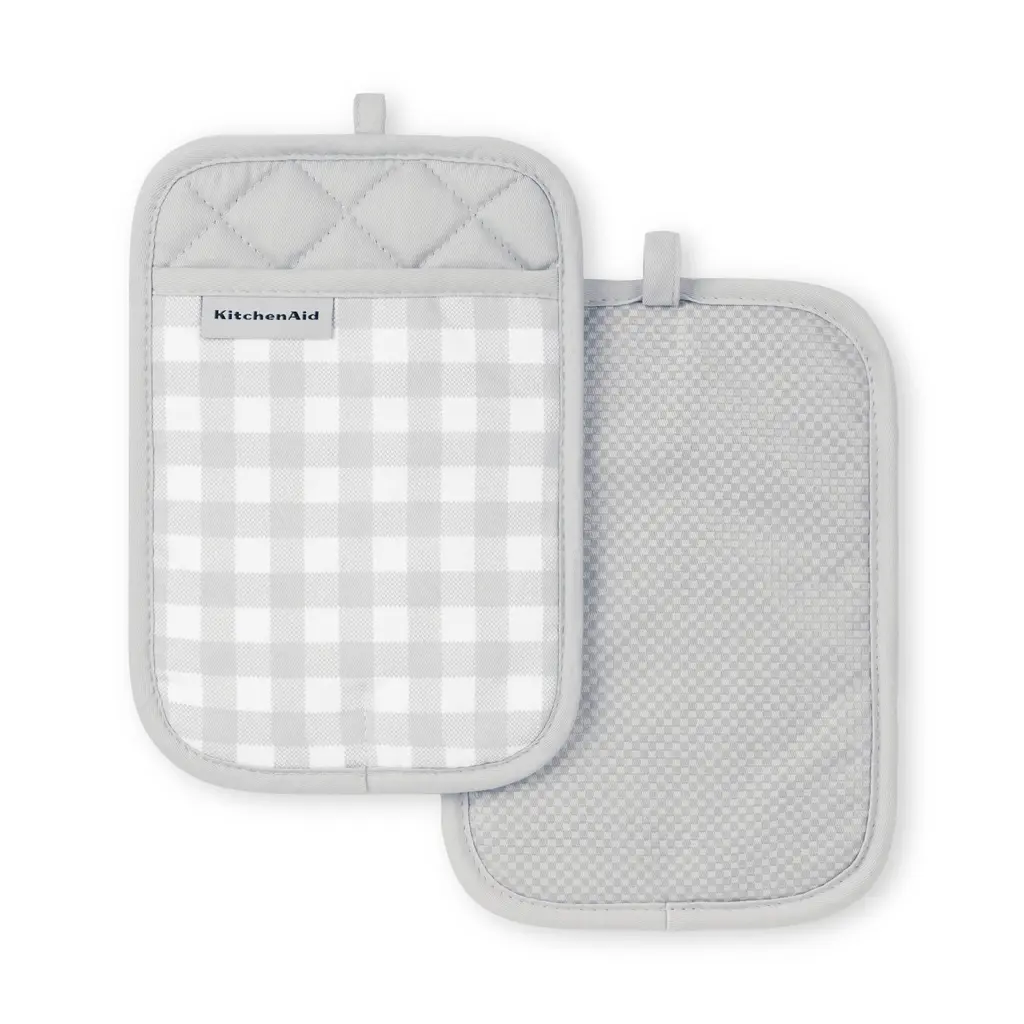 Protect your hands from hot pots and pans with the KitchenAid Gingham 2-Piece Pot Holder Set in Aqua Sky. Each generously sized pot holder measures 7 inches wide by 10 inches and features a classic checkered print pattern. Made of 100% cotton that offers comfort and insulation, these pot holders are heat resistant and feature printed silicone for a more secure grip. This set is machine washable for easy care.