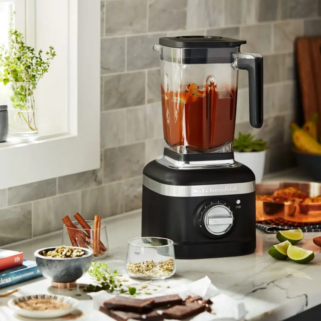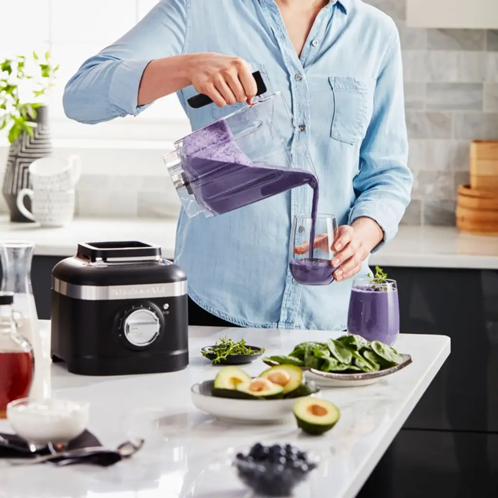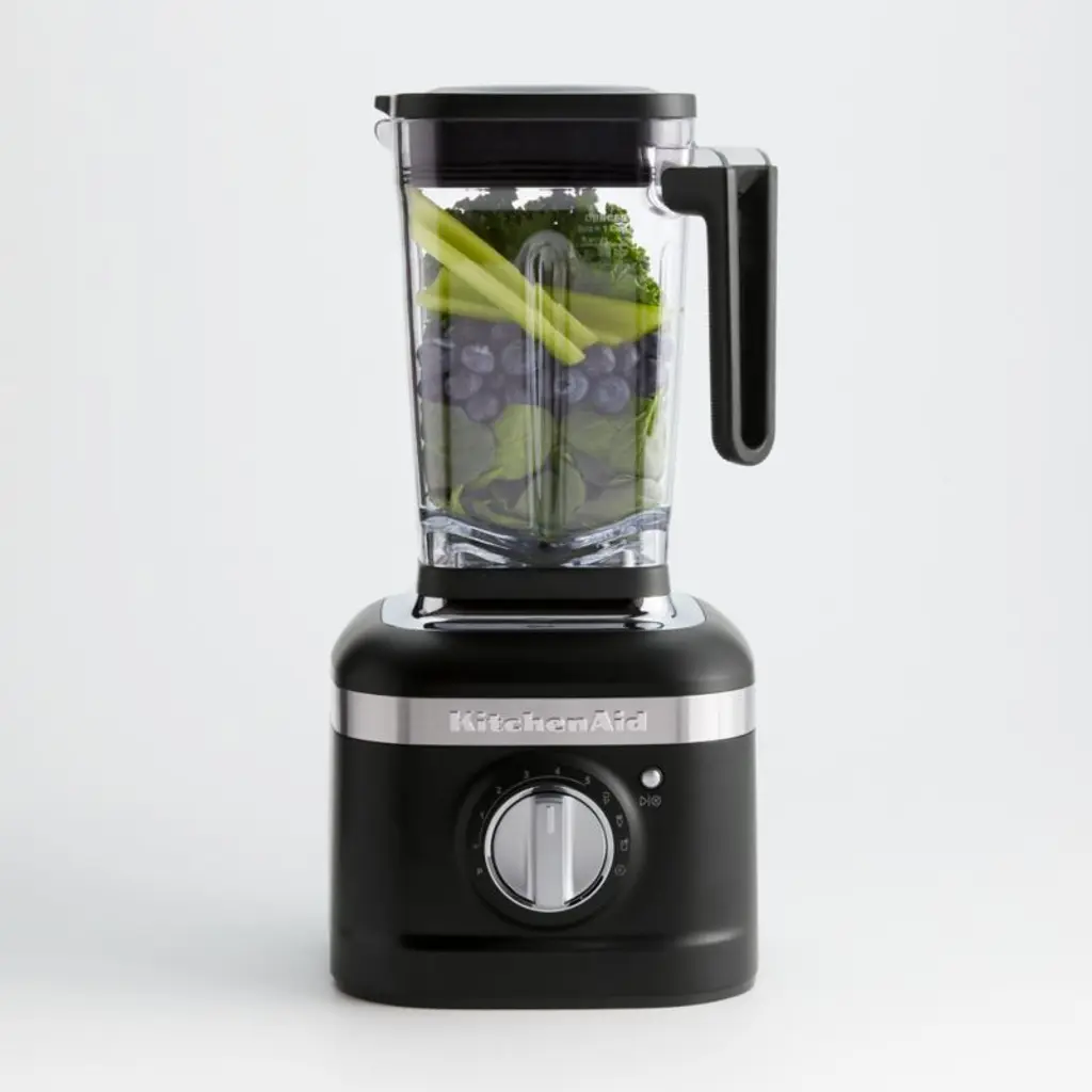 Equipped with a powerful motor and uniquely asymmetrical stainless steel blade, this blender gets perfectly smooth results out of even the toughest ingredients such as chia seeds, kale and carrots. Intelligent motor control senses the contents of the pitcher, maintaining the ideal speed to power through them effectively. Three presets crush ice, mix smoothies and blend festive frozen drinks such as Cucumber Margaritas, Pineapple Daiquiris and Piña Coladas. Clad in on-trend matte black, the five-speed blender fits right in amongst modern appliances.KitchenAid has been creating high-quality kitchenware for over a century.Need help choosing? View our KitchenAid Blender comparison chart.View all KitchenAid products