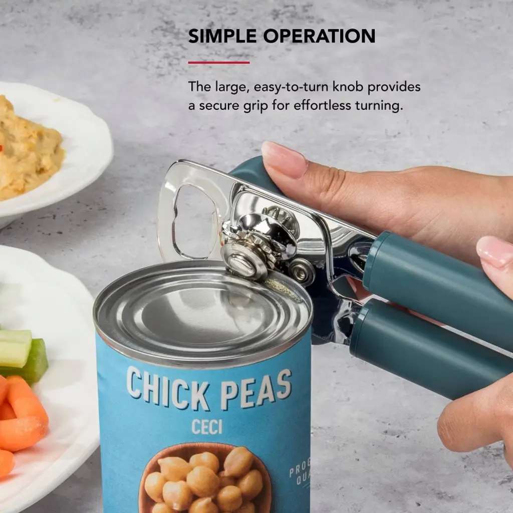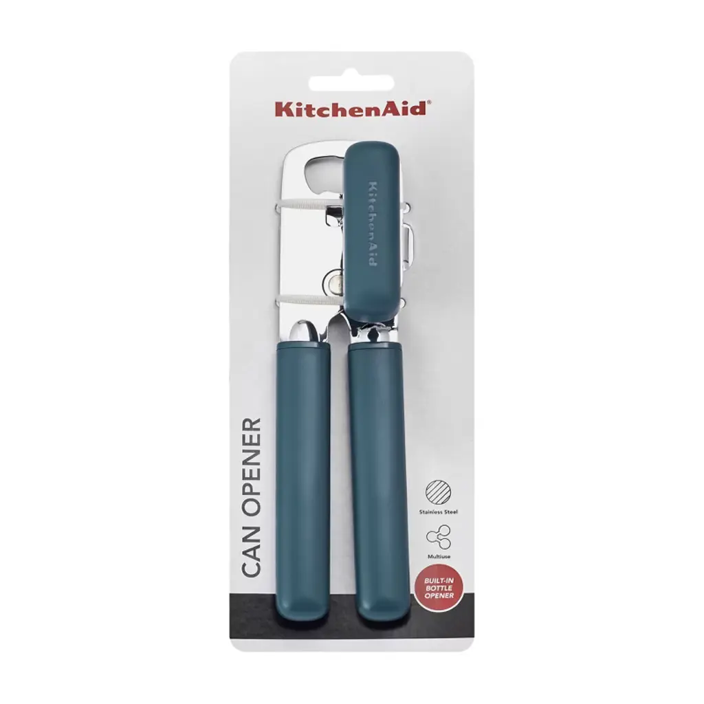 Open any sized can or bottle with the KitchenAid Multifunction Can Opener. The durable, razor-sharp stainless steel cutting wheel easily pierces and smoothly slices through cans, while the large knob provides a secure grip for effortless turning. The oversized, ergonomic handles are perfectly weighted for optimal comfort, balance and control, giving the opener a premium feel in your hand and allowing for simple, safe use. This 2-in-1 tool features an integrated bottle opener to remove caps with ease. Hand wash with warm water and a mild detergent; rinse and dry immediately.