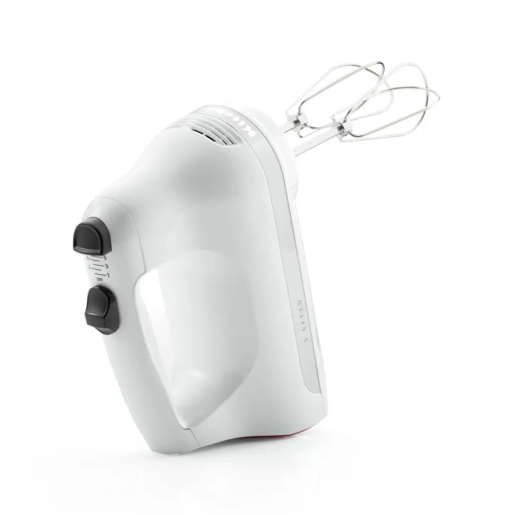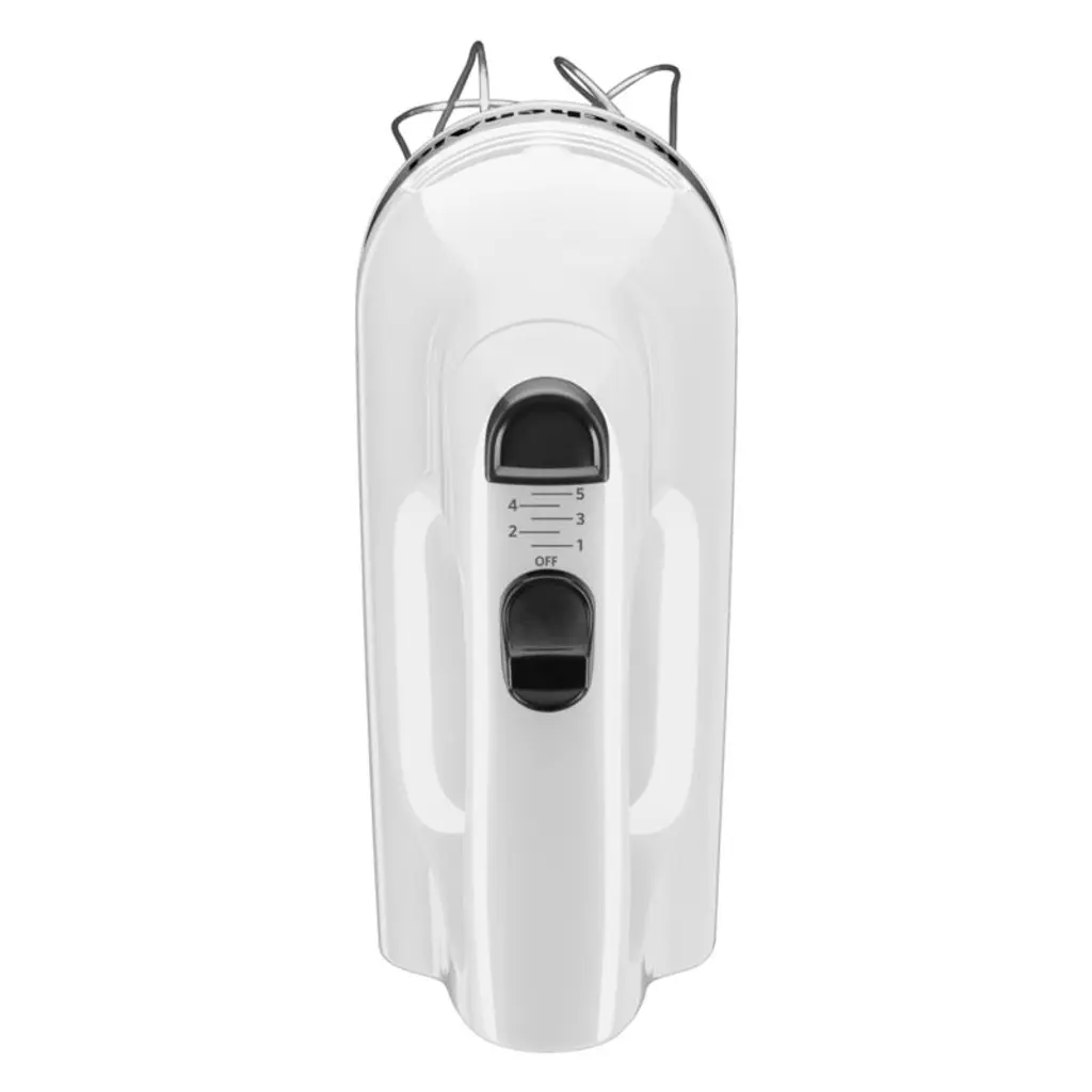 Compact and lightweight, this white hand mixer features five speeds and two turbo beaters to mix up cookie dough, mashed potatoes and so much more. Offering the right speed for the task at hand, the mixer mixes in chunky ingredients, such as nuts or chocolate chips, at speed one or whips egg whites or heavy cream to frothy perfection at speed five.View all KitchenAid products