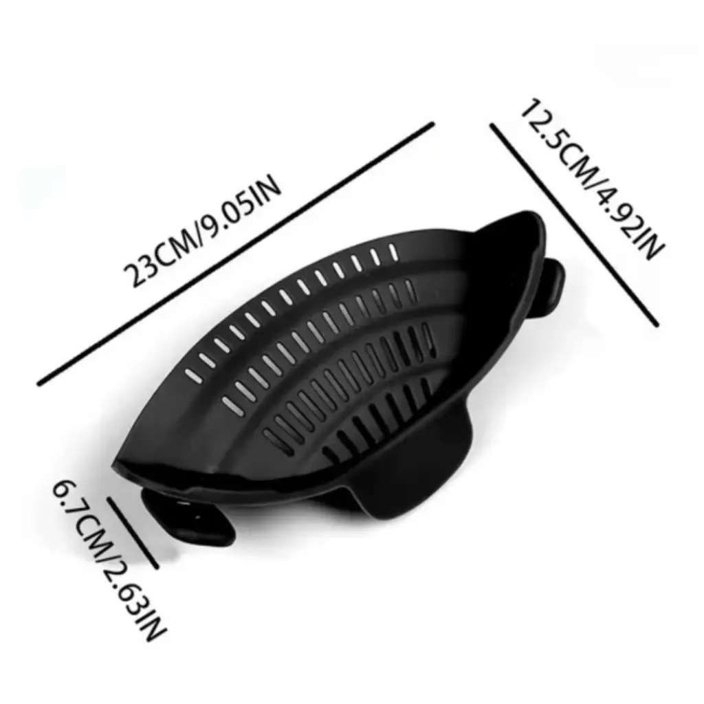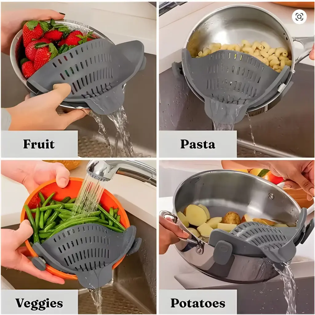 This Adjustable Silicone Clip-On Strainer is a space-saving kitchen tool designed to easily clip onto pots, pans, or bowls for quick and efficient draining. Made of heat-resistant silicone, it securely clamps to most cookware edges, making it perfect for draining pasta, noodles, vegetables, and more—without the need for a bulky colander.