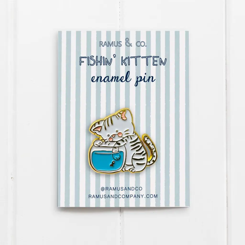 Kitten Greeting Card & Fishin' Kitten Enamel Pin By Ramus & Co