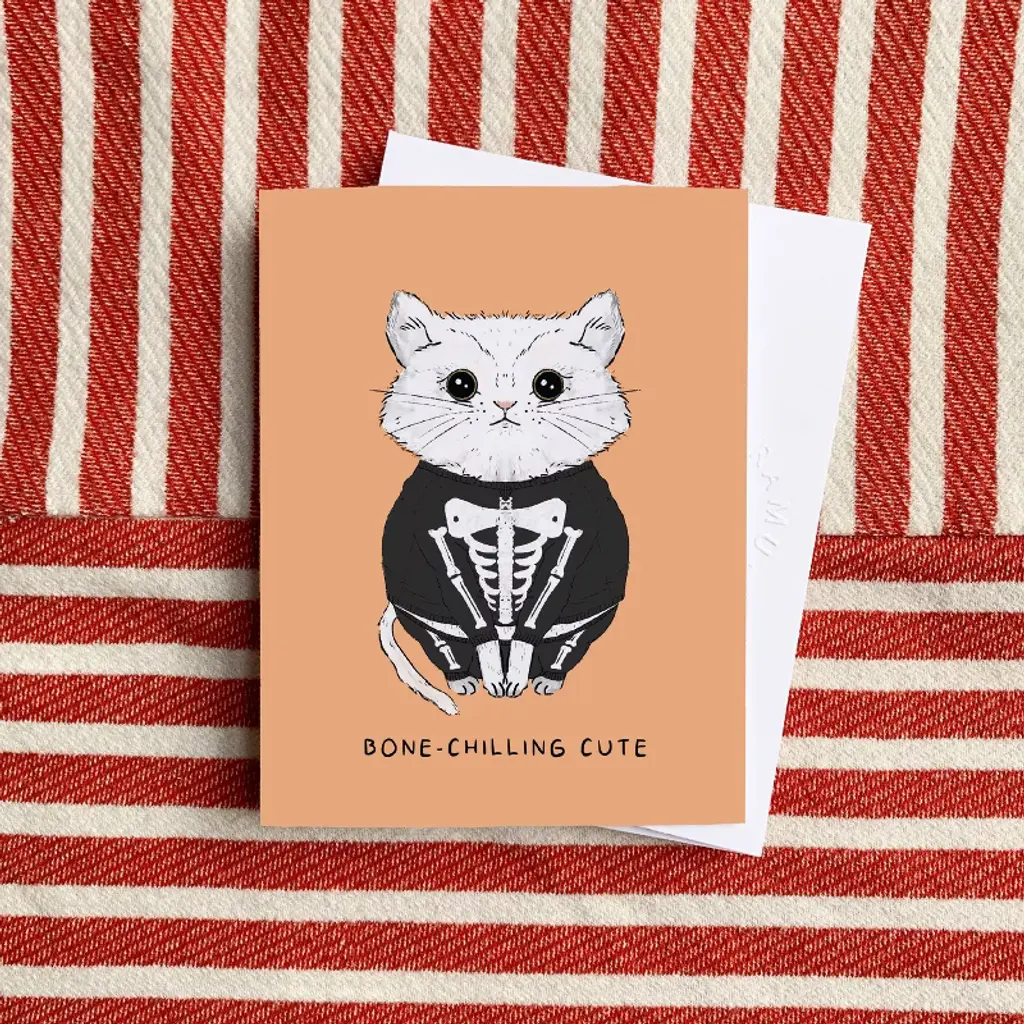 This kitten greeting card is elegantly illustrated by artist Ingrid Ramus, founder and owner of the Ramus & Co brand. Card is blank inside. This combo pack also includes a matching enamel pin. All greeting cards are made in the USA on heavyweight uncoated and locally-manufactured card stock. Each card is individually wrapped in a plastic sleeve. Each card is accompanied by a hand-embossed envelope made with heavyweight 95lb paper and a peel-and-stick flap - no licking envelopes here! All Ramus & Co. greeting cards are printed on FSC and SFI certified paper sourced from a regional mill that harnesses 66% of its energy from on-site sustainable sources, such as emission-free hydroelectricity and biomass co-generation from wood waste. Husband-and-wife team Calvin and Ingrid Ramus founded Ramus & Company in 2019, in New England, USA. Ingrid, the creative designer behind the brand, originates from Mexico, where she cultivated her skills in fashion and textile design. Drawing from her unique and inquisitive perspective on preppy style, Ingrid prolifically designs whimsical yet classic stationery and lifestyle items.