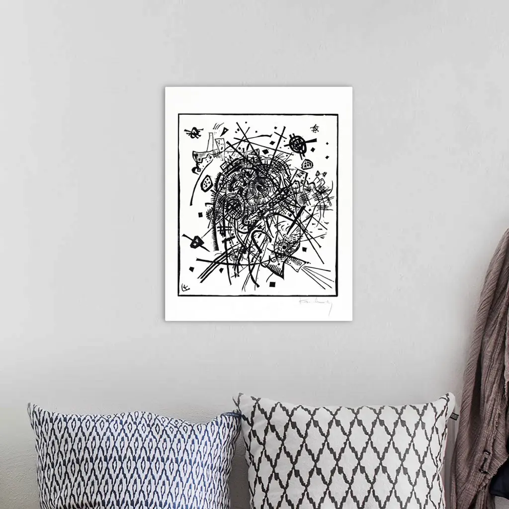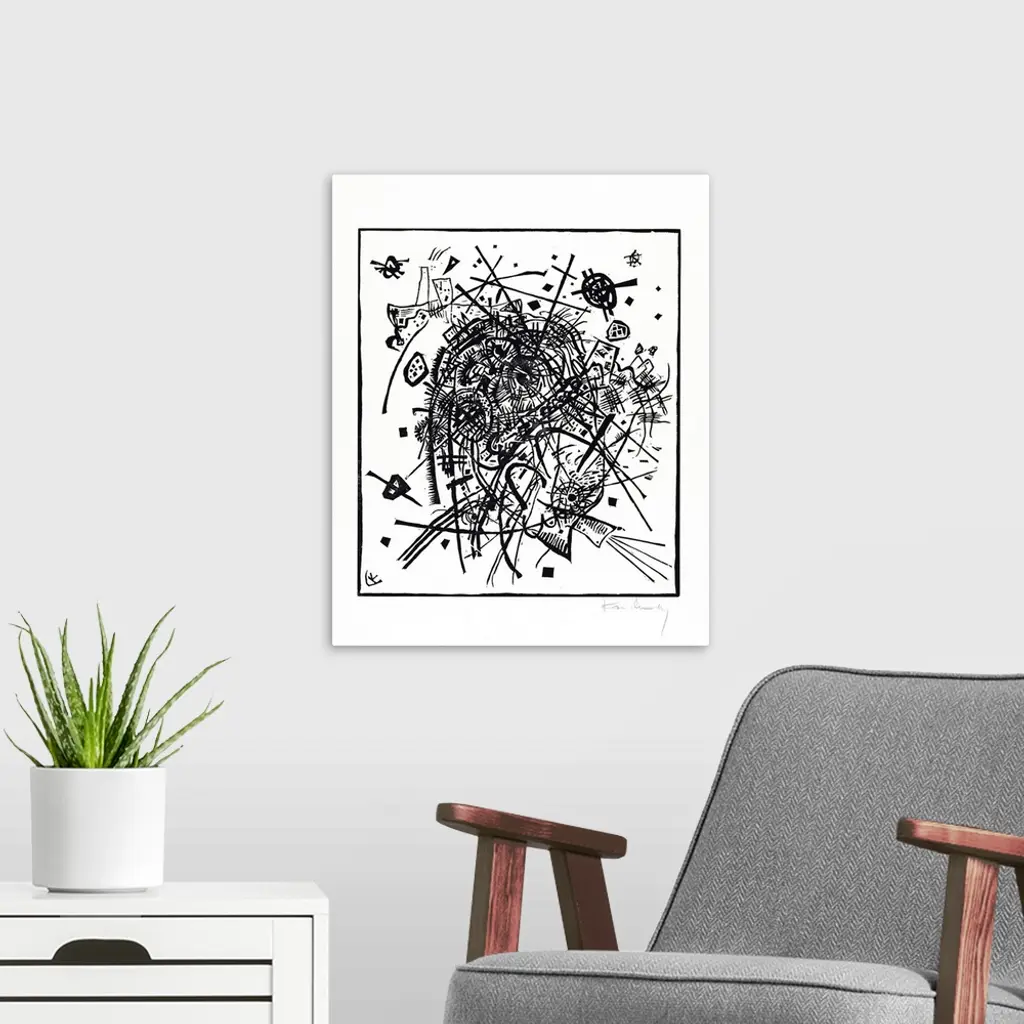 Kandinsky made the Small Worlds (Kleine Welten) portfolio while teaching at the Bauhaus, the influential German art school founded after World War I. For Kandinsky, abstraction was a spiritual language. In these poetic images, he creates a vibrant interplay of line and form, while capitalizing on the strengths of each printmaking method, in order to evoke different sensations or worlds. He used three techniques-drypoint, woodcut, and lithography-each of which had distinct, and for Kandinsky, symbolic, properties. Drypoint, which he regarded as aristocratic, creates sharp, precise lines, while woodcuts produce a richer texture and depth. Contrasting with these traditional techniques is lithography, which the artist viewed as modern and democratic because it offered a smooth surface, a rich vocabulary of colors and marks, and the opportunity to create a seemingly endless number of impressions.