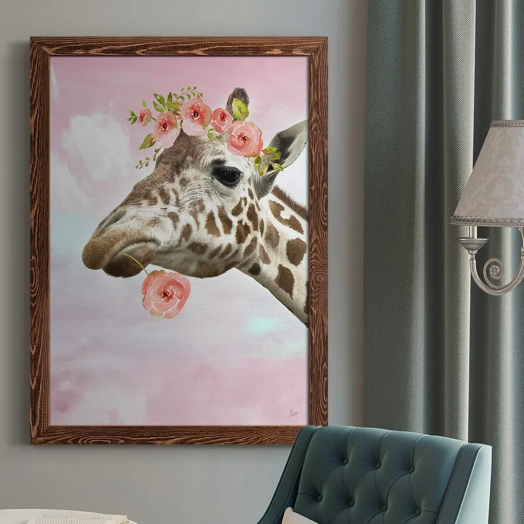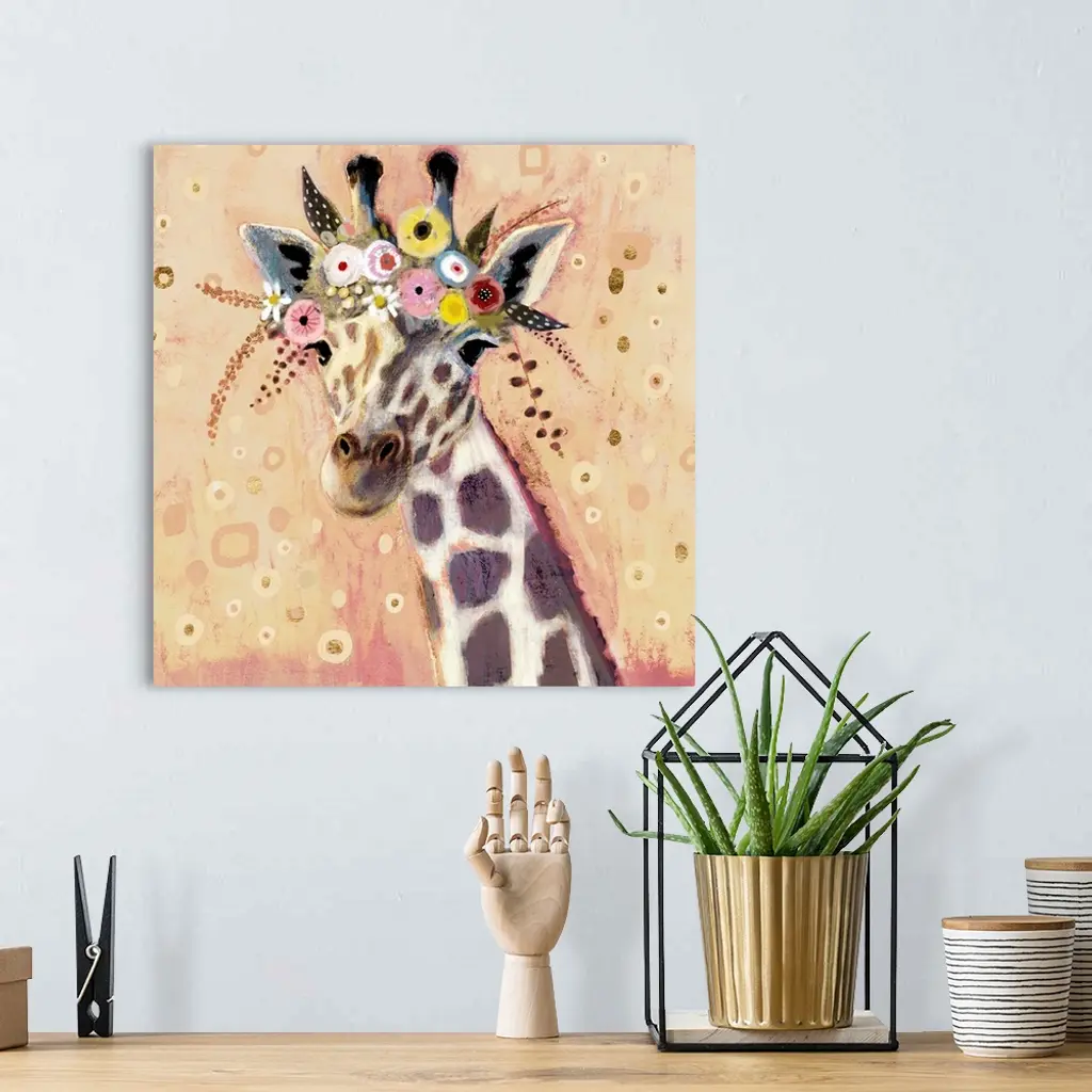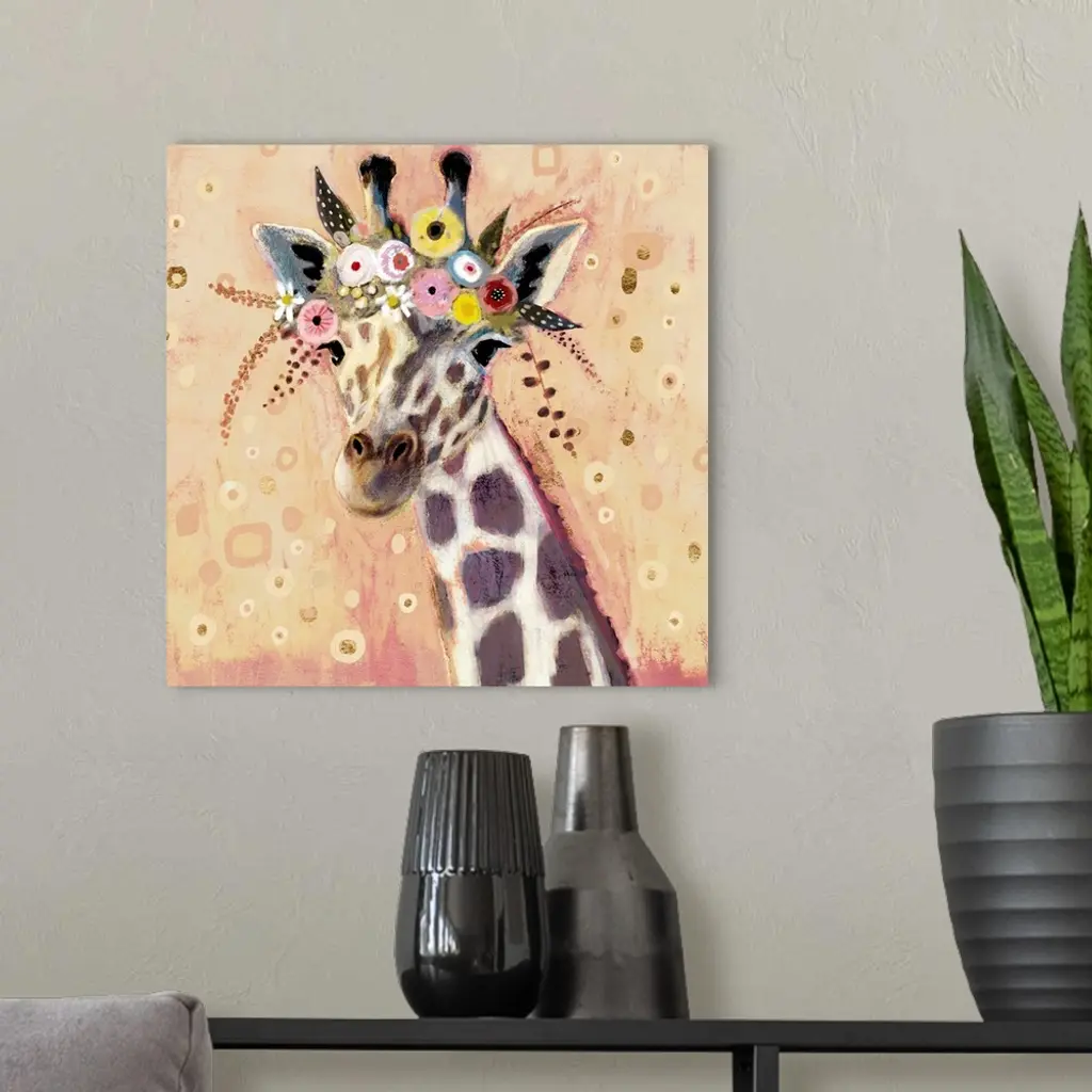 A creative youthful image of a giraffe wearing flowers on it's head, against a neutral background with small circular shapes.