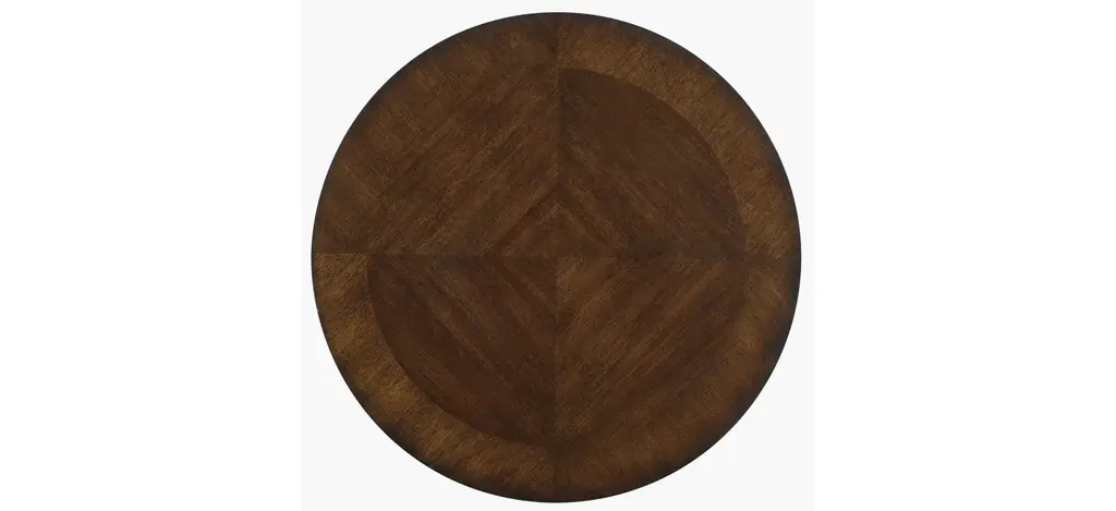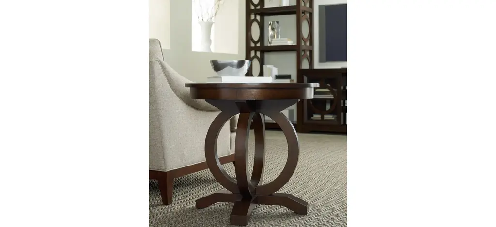 With its circular top and interlocking circular base, the Kinsey Round End Table exudes energy and exuberance. Crafted of Quartered Walnut Veneer in an alluring dark finish, Kinsey brings modern elegance to your home.