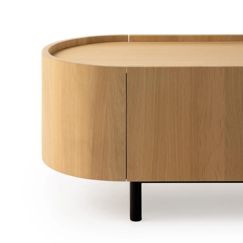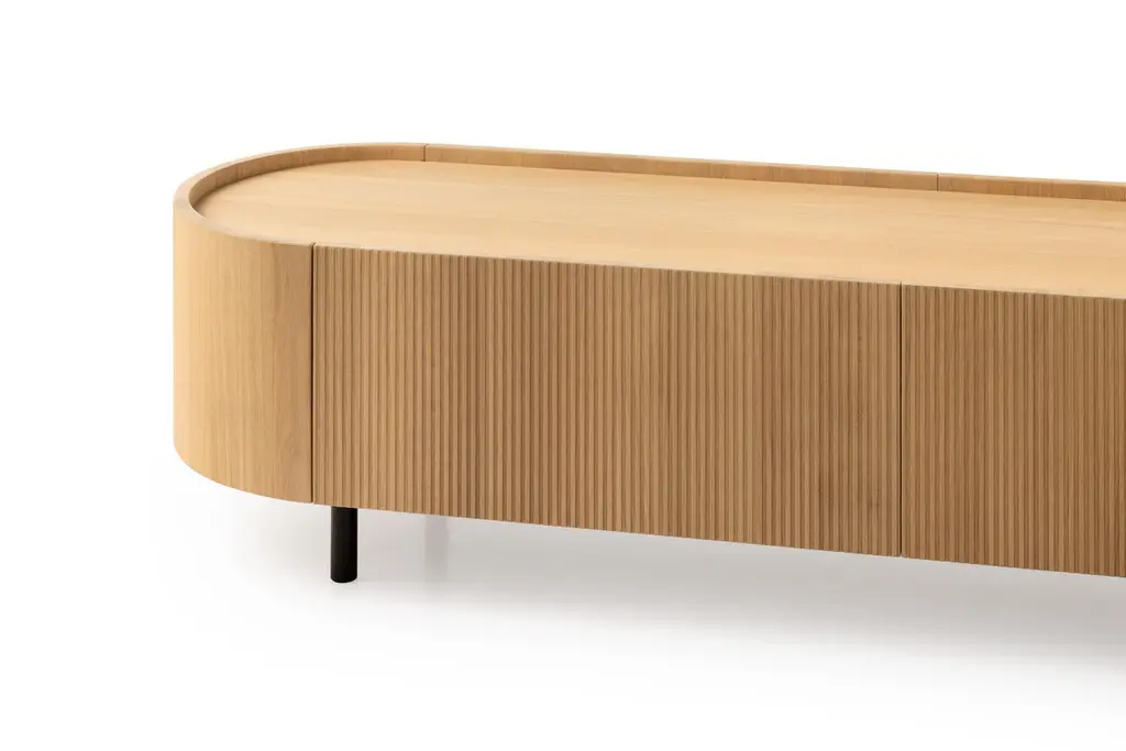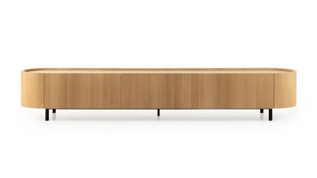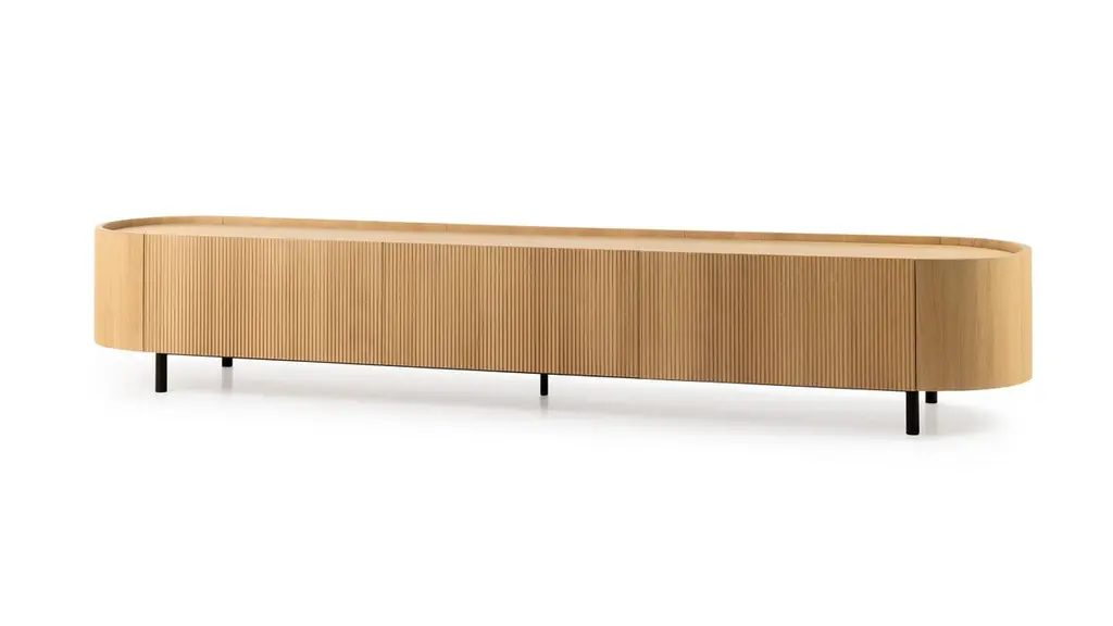 This beautiful TV-Lowboard in solid matt varnished oak is an enrichment for any interior and a future heirloom. The version shown is 240cm wide, 41cm high, 47cm deep and has 3 flaps. If desired it can be made with beautiful vertical accents, the transitions of the doors do not stand out. The lowboard is available in any size from 100cm to 300cm. Additional flaps or drawers are always possible. The height can also be adjusted as desired. The back is not solid but made of veneered sheet material. It can also be made solid on request. The frame consists of black steel. The wood can be made in many different tones of oak or even in solid walnut.Work with quality, live with quality!