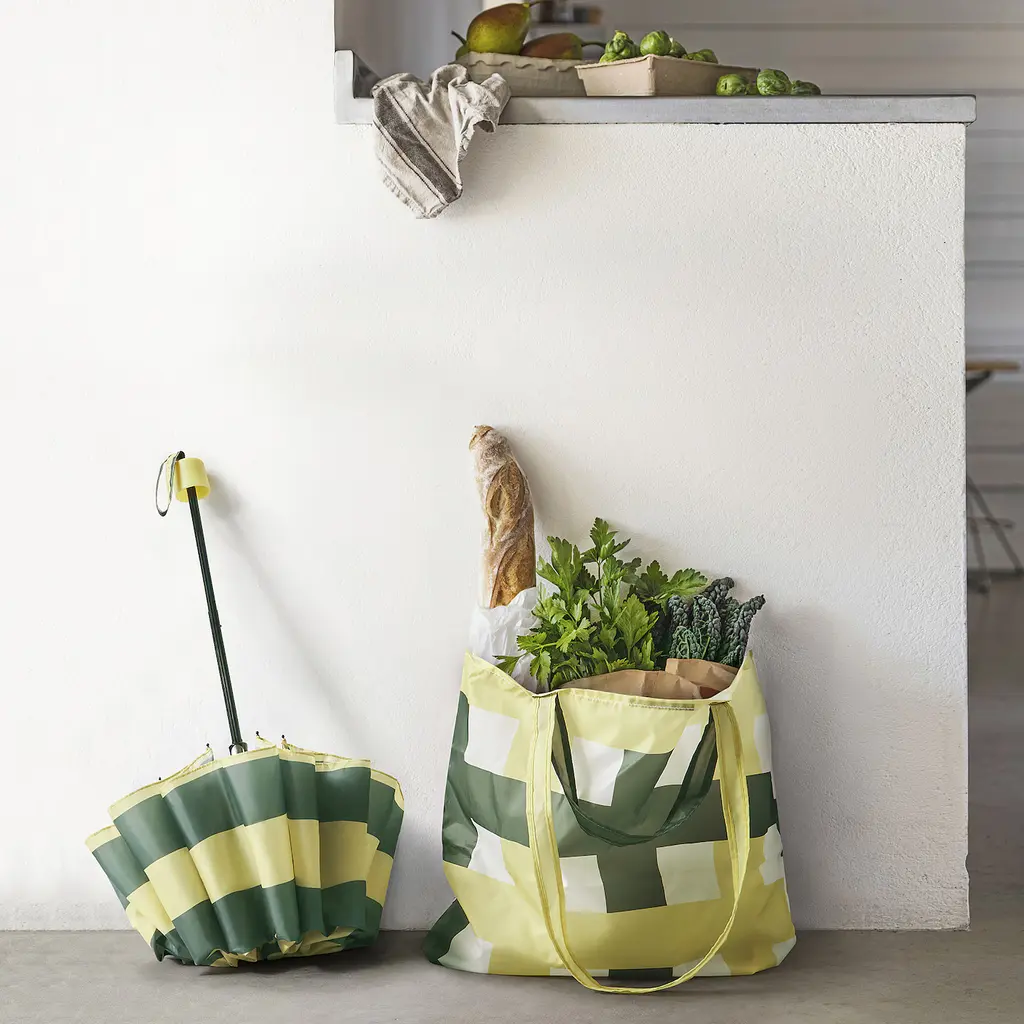 KNALLA Umbrella - foldable green/stripe. Easy to keep on hand since it folds very small and fits in your handbag, briefcase or coat pocket. You can store the umbrella in the protective cover. The handle has a strap that makes the umbrella easy to carry – and hang on any hook.