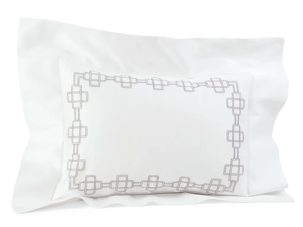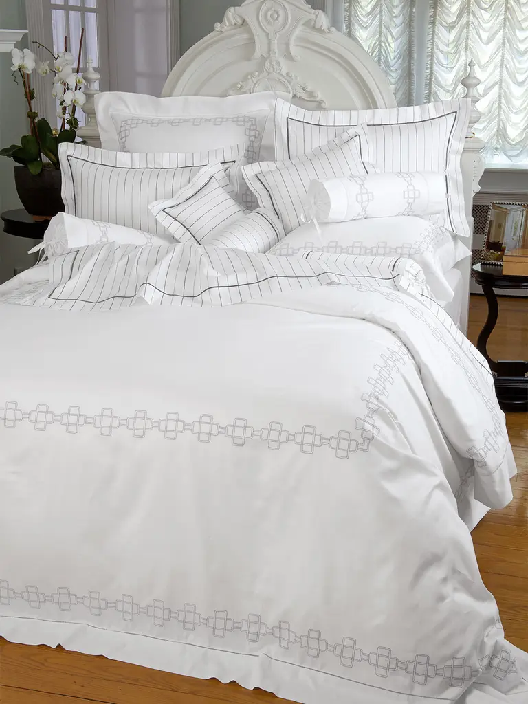 Embroidered by hand with a chain of links inspired by heraldic shields from medieval times, lustrous Egyptian cotton sateen from Italy, 600 thread count, makes a bold statement on behalf of timeless décor. This exciting import can be yours in Ivory with Black or White with Gray embroidery, tailored with impeccable hand hemstitching and knife-edge flanges.