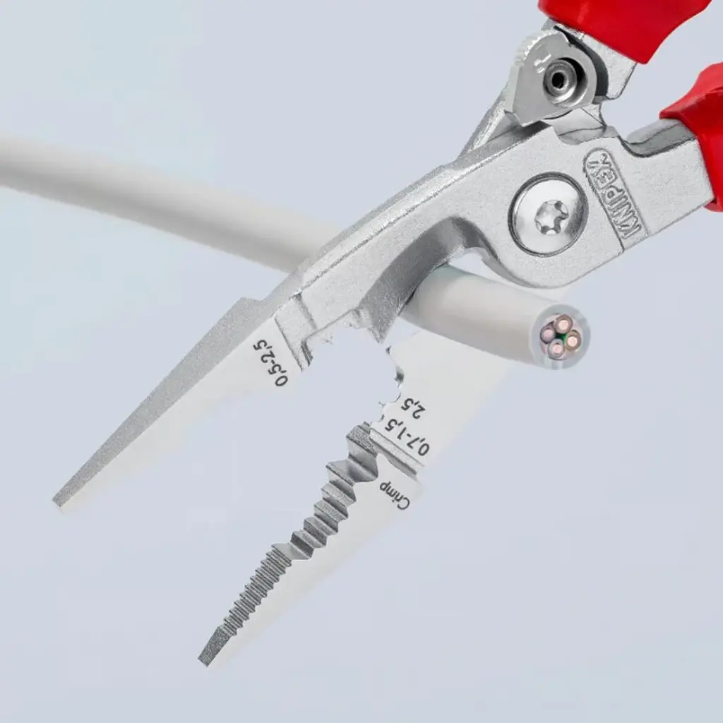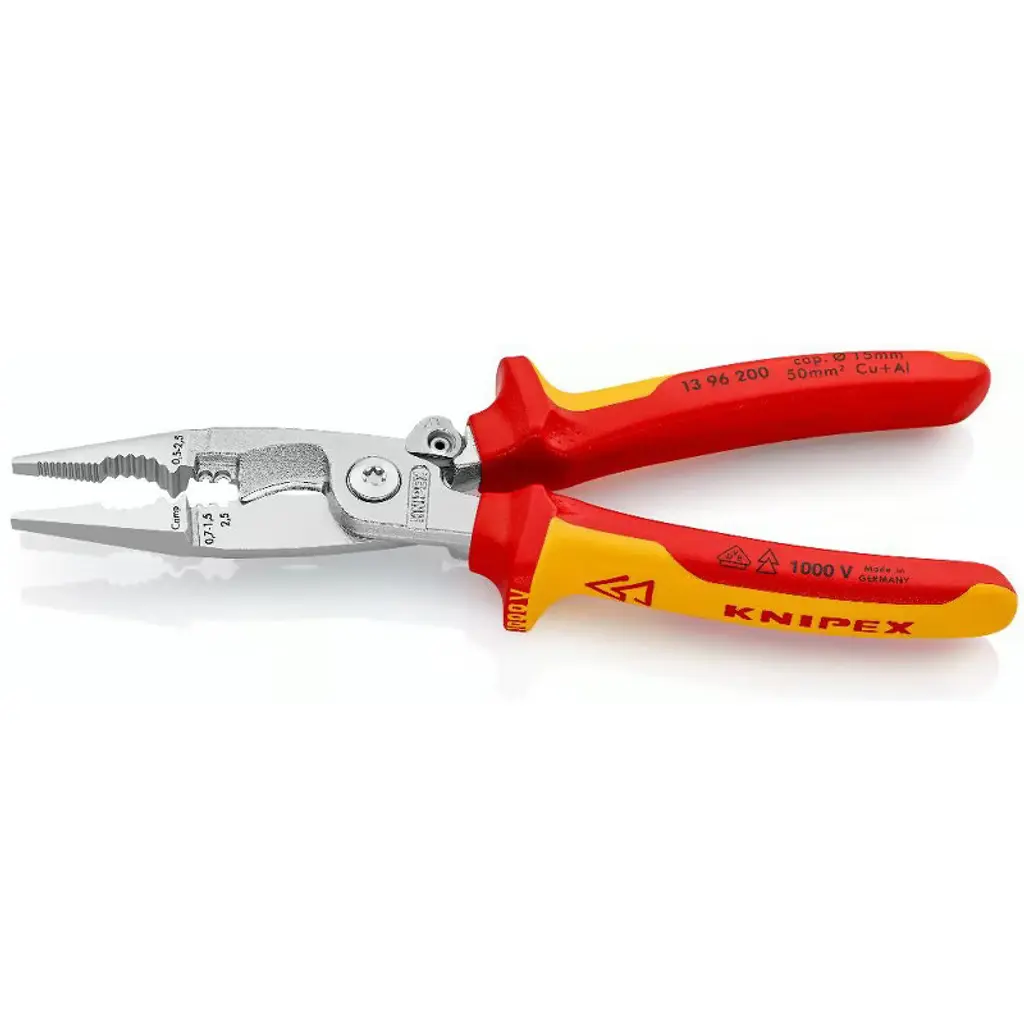 13 96 200 SB Pliers for Electrical Installation 6 functions in one pair of pliers. multifunctional pliers for the electrical installation; to grip flat and round material, for bending, deburring, cutting cable, stripping and crimping wire ferrules. Smooth surfaces near the tips grip single cores without damaging them; serrated gripping surfaces and pipe grip for gripping flat and round material. Clear-cut outside edge on the gripping surfaces for working on flush-mounted junction boxes and deburring feed-through holes