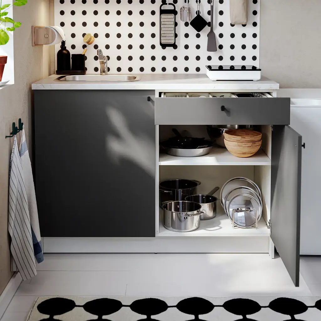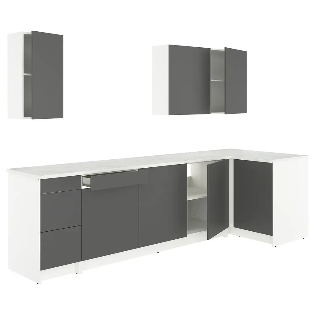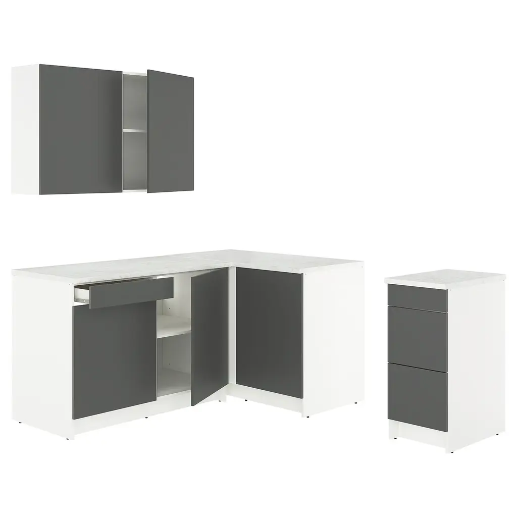 KNOXHULT Kitchen - dark gray 93x24x88 ". Dark grey fronts combined with a white marble effect worktop brings a modern air to your kitchen and makes it feel warm and inviting. A compact setup for smaller kitchens with planned space for all the functions you need in one practical solution.