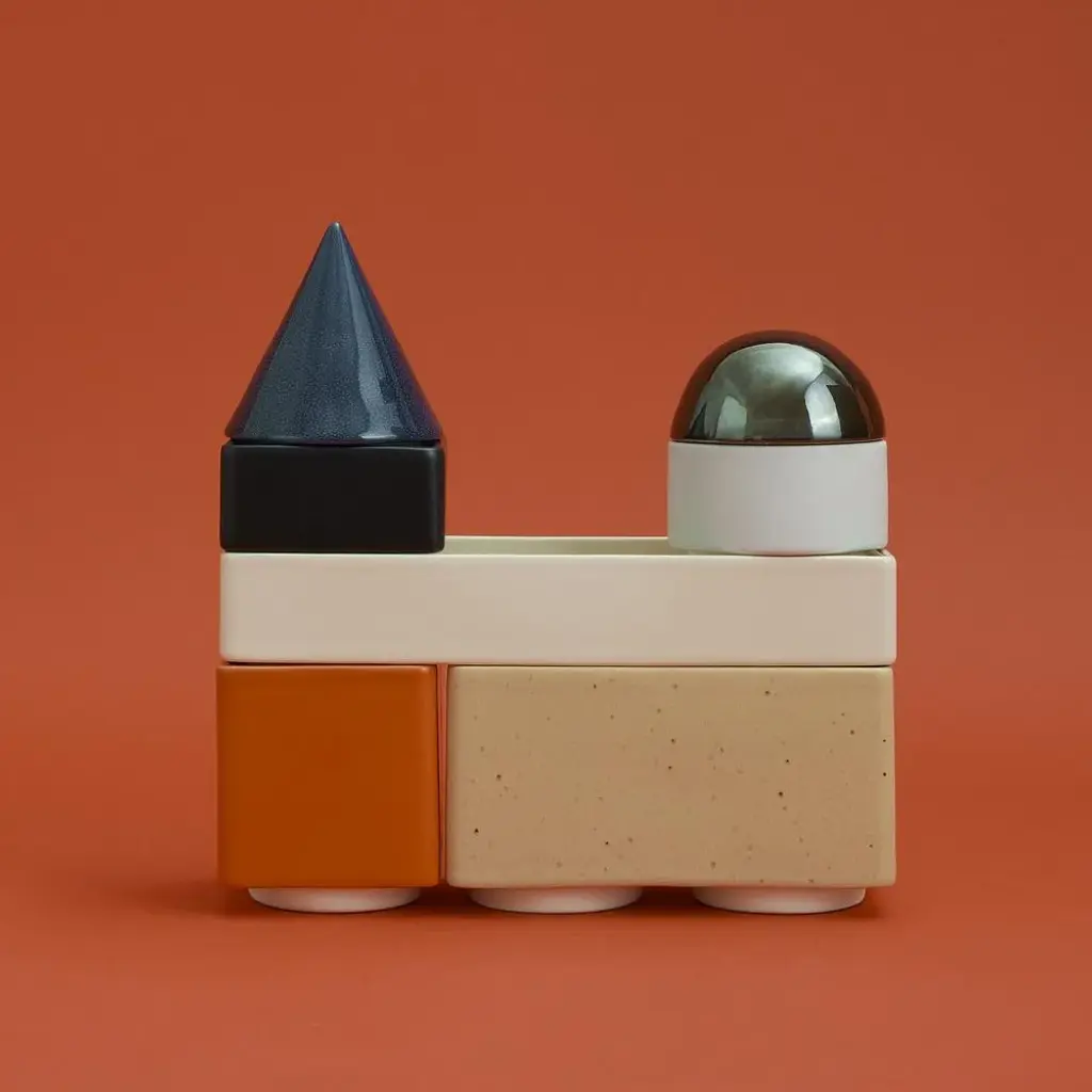 This set is one of nine different KNSTRKTsets, offered across multiple categories. View the full collection on our profile page. KNSTRKT is a stackable tableware collection designed to be the building blocks for your creative display and storage ideas. Use it to hold your snacks, store your treasures, organize your desk, or keep your bathroom accessories in order. play, create & collect. Inspired by the Italian Design movement, KNSTRKT combines the principles of stackable industrial tableware with the playfulness of postmodern design. Due to high demand over the last two years, we have recently outsourced our in-house production from Berlin and are now very excited to produce our tableware in collaboration with skilled artisans at a ceramic manufactory in Portugal. Stamped by Maker