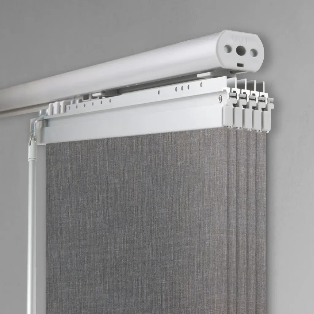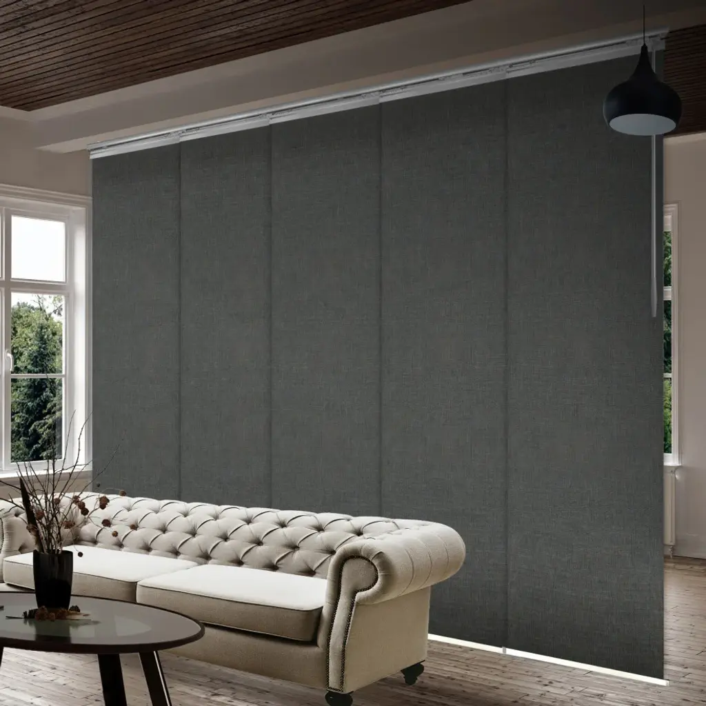 Central Design Products is pleased to introduce a new innovative panel track that offers easy 2-way installation, adding an alluring style and refined touch to your home decor. The single rail design of the track is sleek, compact, and reduces the overall footprint and weight of the installation, eliminating bulky, intrusive window treatments. Adjusting the panel height is a breeze � simply trim the panel, re-attach the liner, and install the panel weight. Detailed instructions are included.The panel track also features a patented slider design, made with aluminum and fitted with bearings that allow for durable and smooth operation. The sliders are stacked closer together than conventional panel tracks, reducing light bleed coming from the gaps between panels. This track has endless uses from dividing rooms, garages, offices, and closets to decorating windows and patios. Available in larger sizes including 8, 10, and 12 panels. Extends from 58-110� wide. Each panel measures 23.5" wide and 91.5" tall, with a total installation height of 94" (includes the 2.5" rail track). The track can be wall or ceiling mounted. The panels can stack on the left or the right. The clearance from the wall is extendable from 1.25� to 3.25� and projection from the wall is extendable from 3� to 4.25�. Koala Gray panel is made from 100% Polyester, with a light filtering shade that blocks 70% of the light.