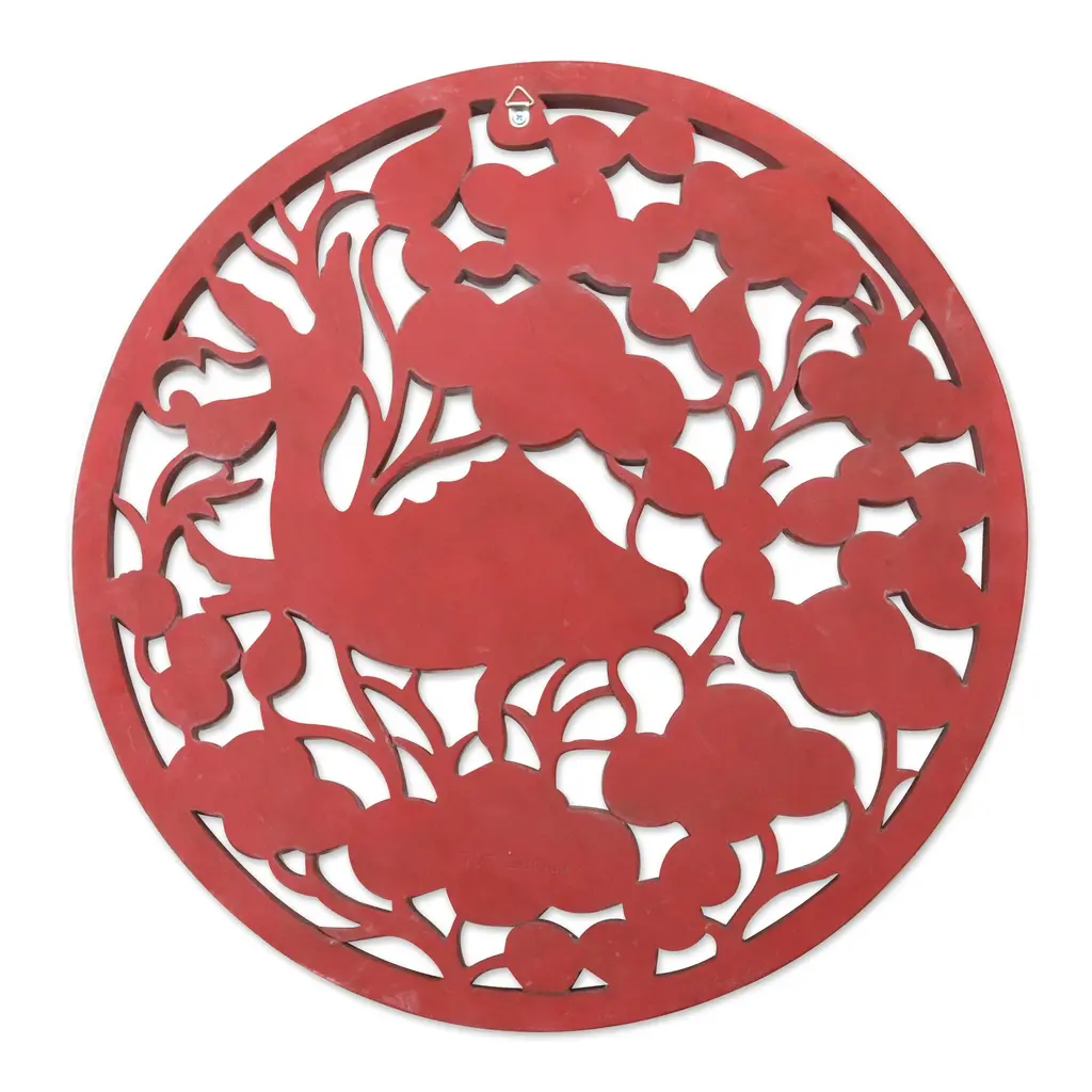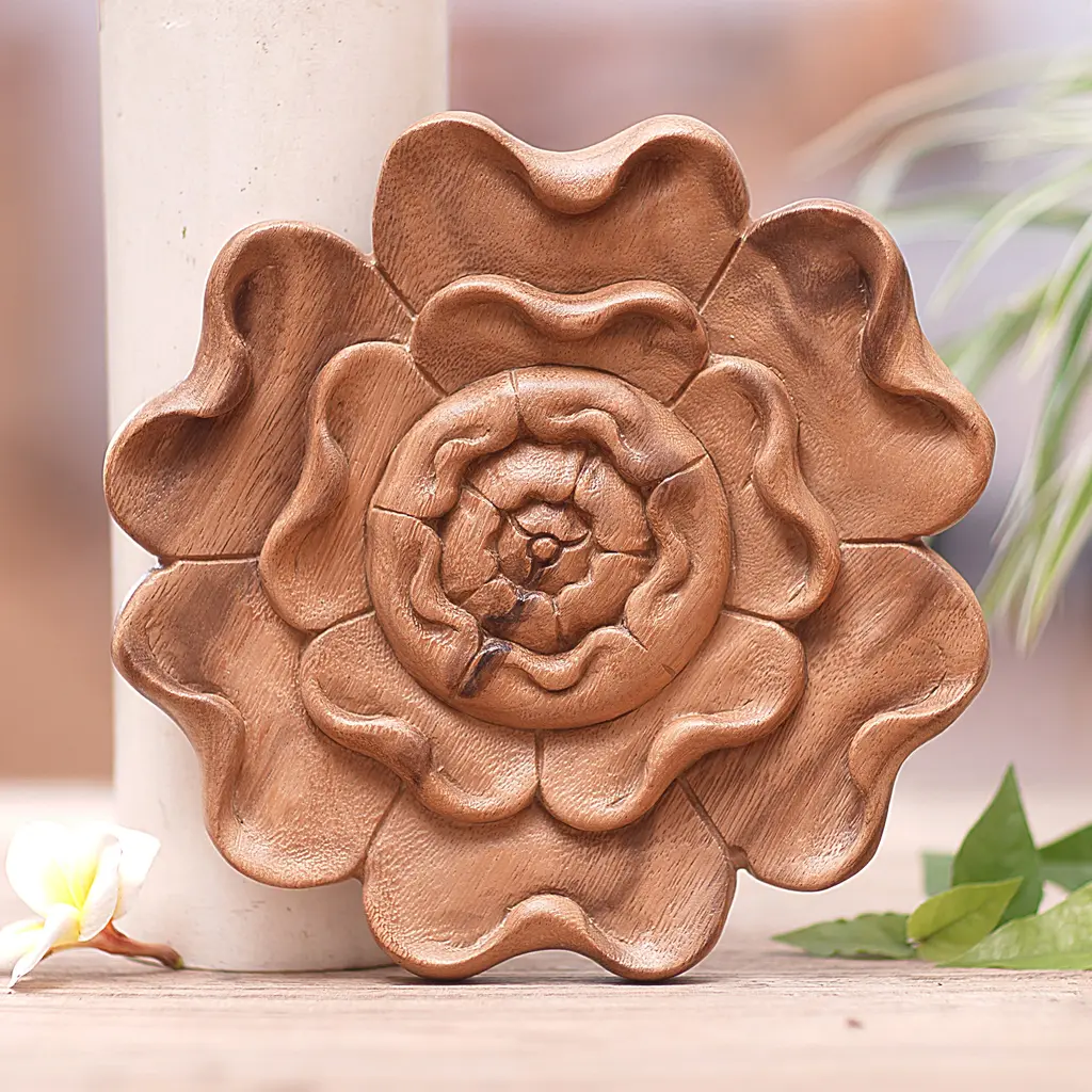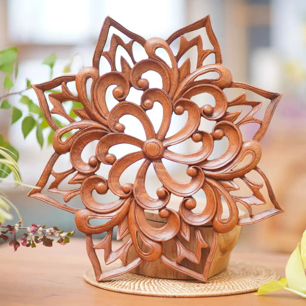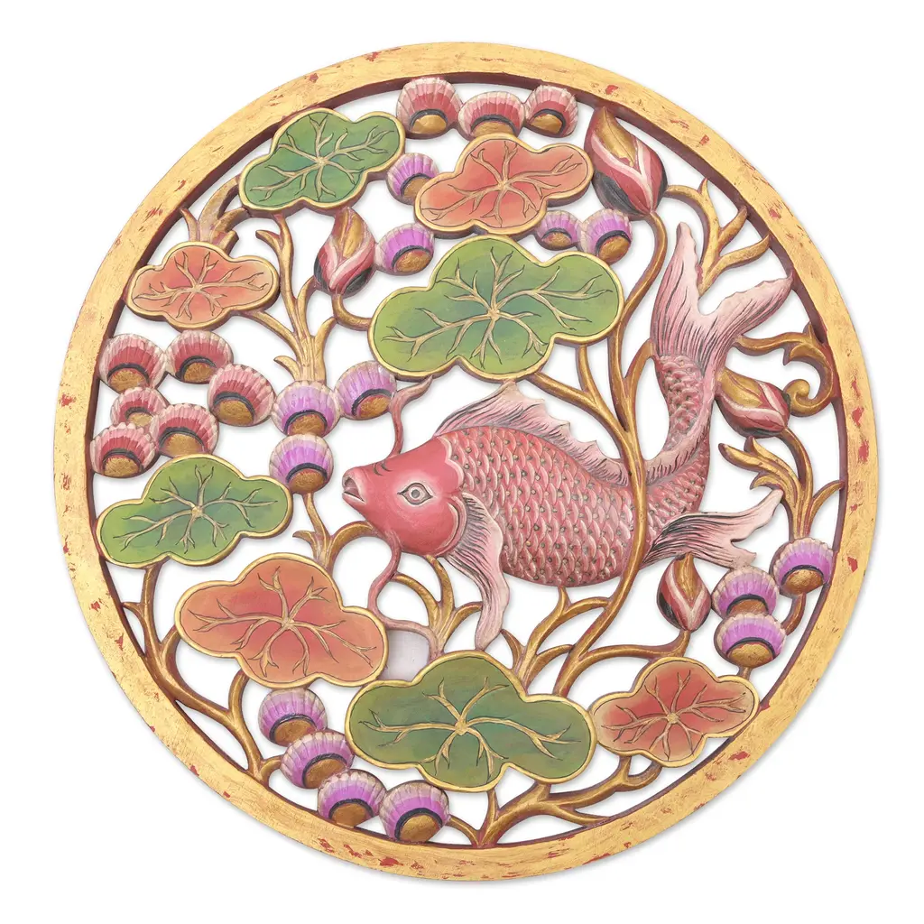 Balinese artisan Ketut Sudantara carves this relief panel depicting a koi fish in an aquascape from solid suar wood with traditional plant motifs originating from Bali's rich history. Dedicated to providing for his daughters, Sudantara carries on the family tradition of woodcarving by adding colors to the traditional reliefs of Bali.
