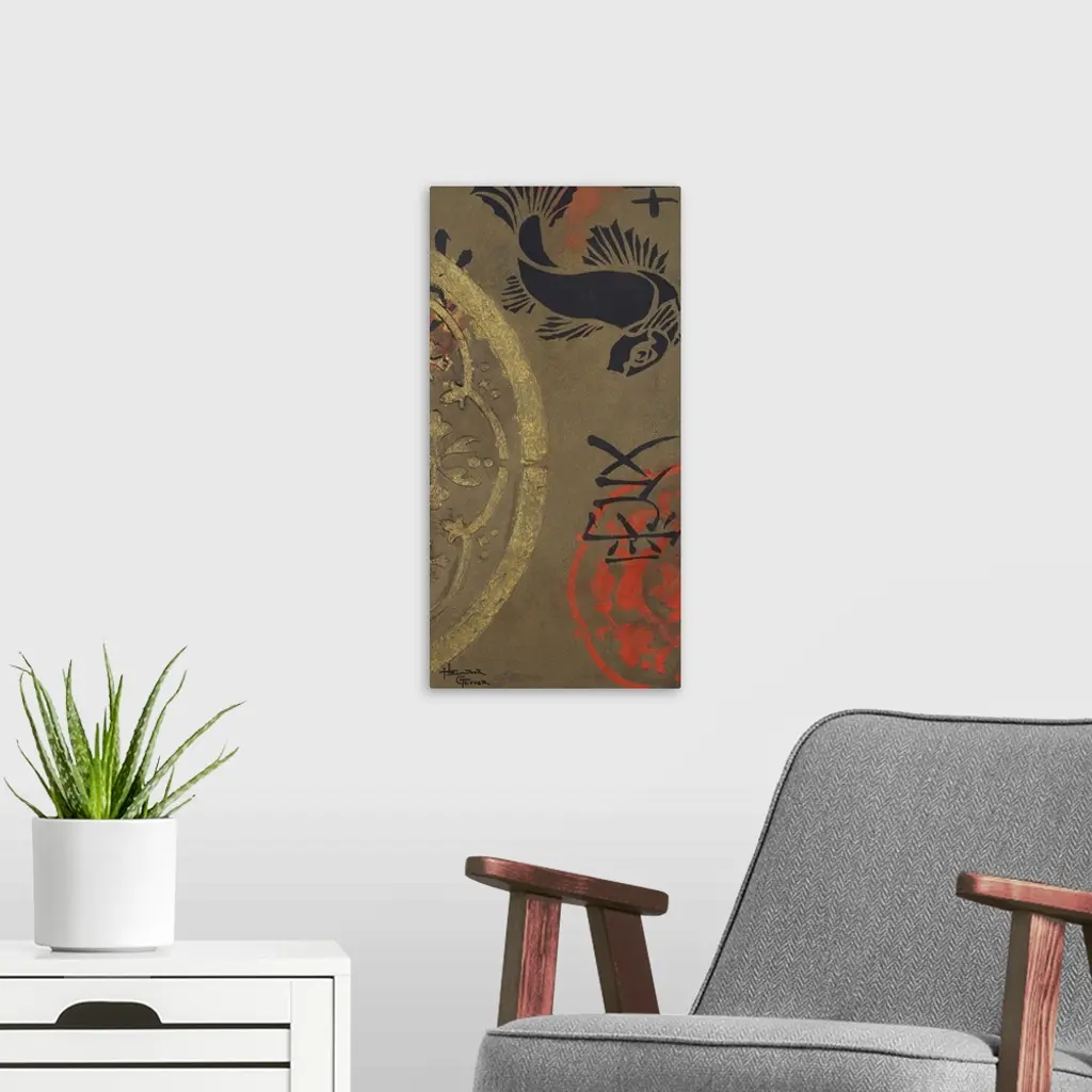 Tall canvas print of a koi fish stencilled onto a canvas with various patterns.