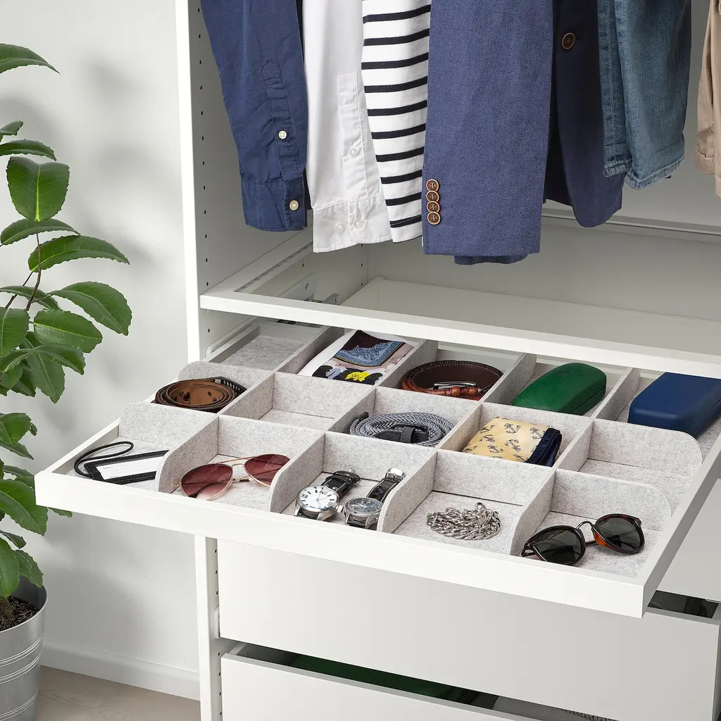 KOMPLEMENT Pull-out tray with divider - white/light gray 29 1/2x22 7/8 ". 10-year Limited Warranty. Read about the terms in the Limited Warranty brochure. You can easily see and reach your things since the tray pulls out. Slides back slowly, silently and softly thanks to an integrated damper.