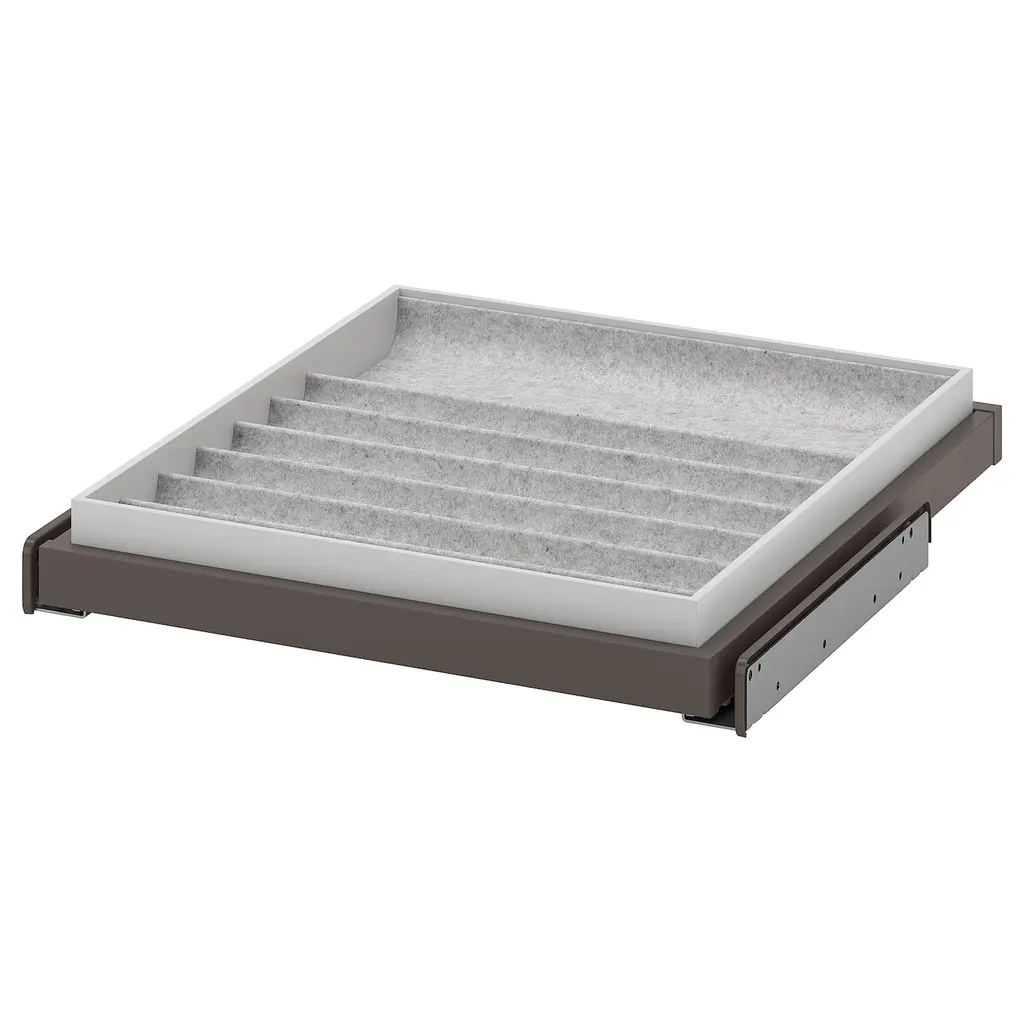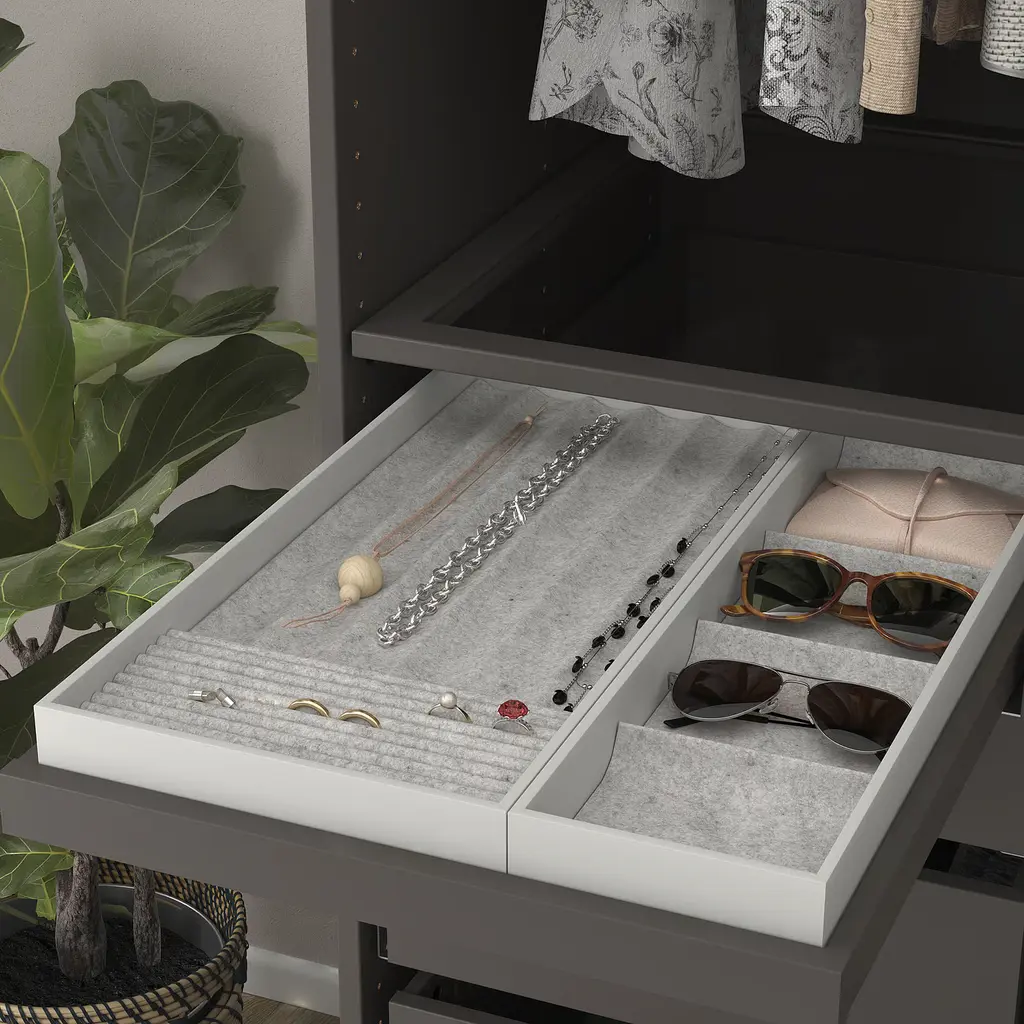 KOMPLEMENT Pull-out tray with insert - dark gray/light gray 19 5/8x22 7/8 ". The insert helps you store and organize your necklaces, rings, earrings and other accessories like sunglasses and watches. Soft felt protects your accessories and keeps them neatly in place.