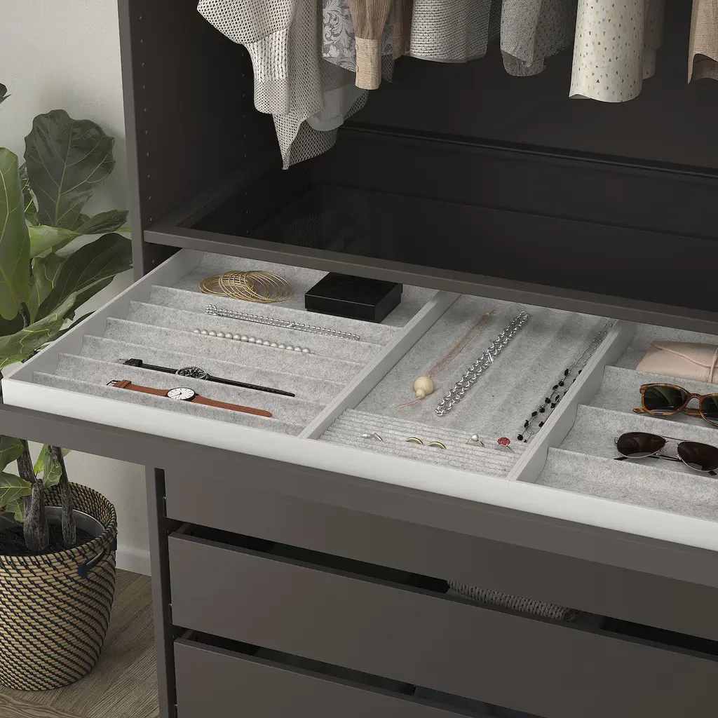 KOMPLEMENT Pull-out tray with insert - dark gray/light gray 39 3/8x22 7/8 ". The insert helps you store and organize your necklaces, rings, earrings and other accessories like sunglasses and watches. Soft felt protects your accessories and keeps them neatly in place.