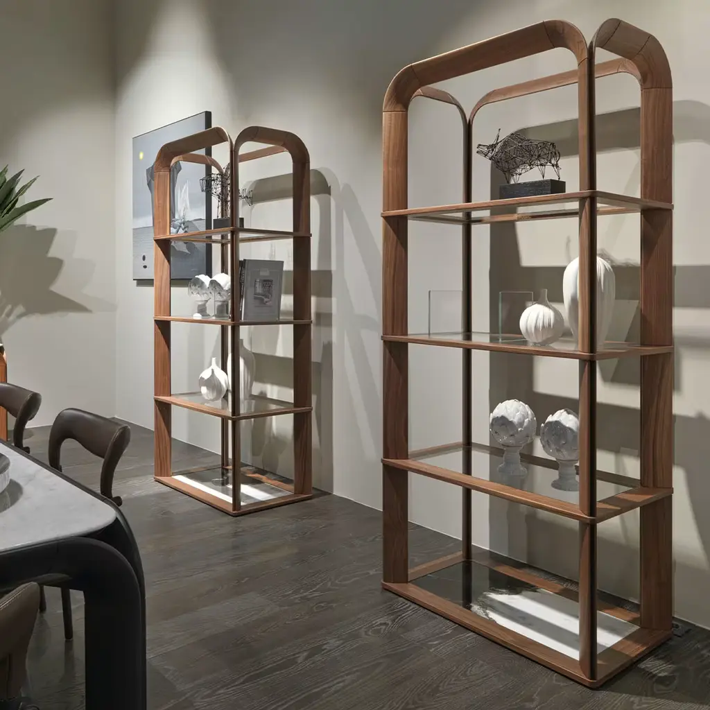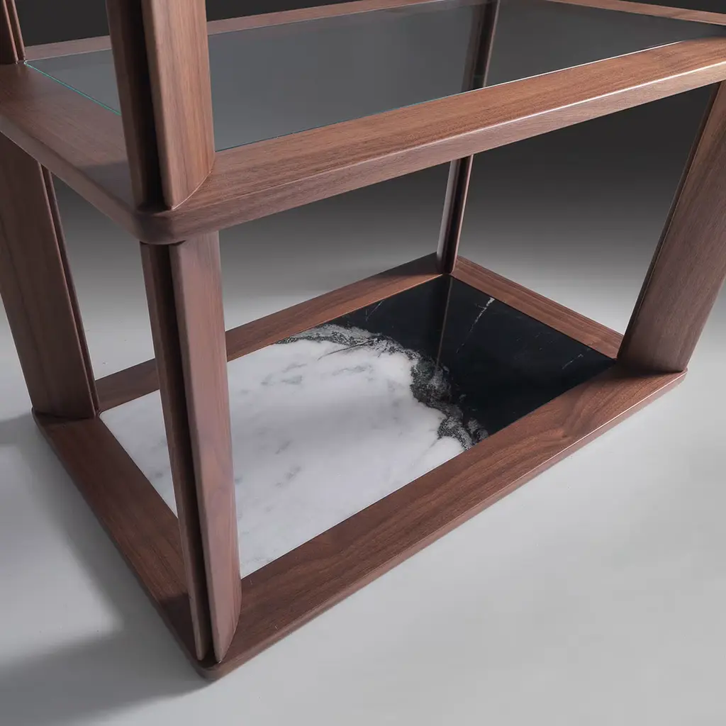 Profiles tracing fluid and harmonious curves define the sculptural silhouette of this exclusive etagère in fine Canaletto walnut. Part of the Kong Collection, it allows to elegantly distribute collectibles and precious trinkets on its three glass shelves and lower shelf in precious marble. Brimming with timeless flair, it seduces with those unique shades and grain Canaletto walnut naturally showcases.