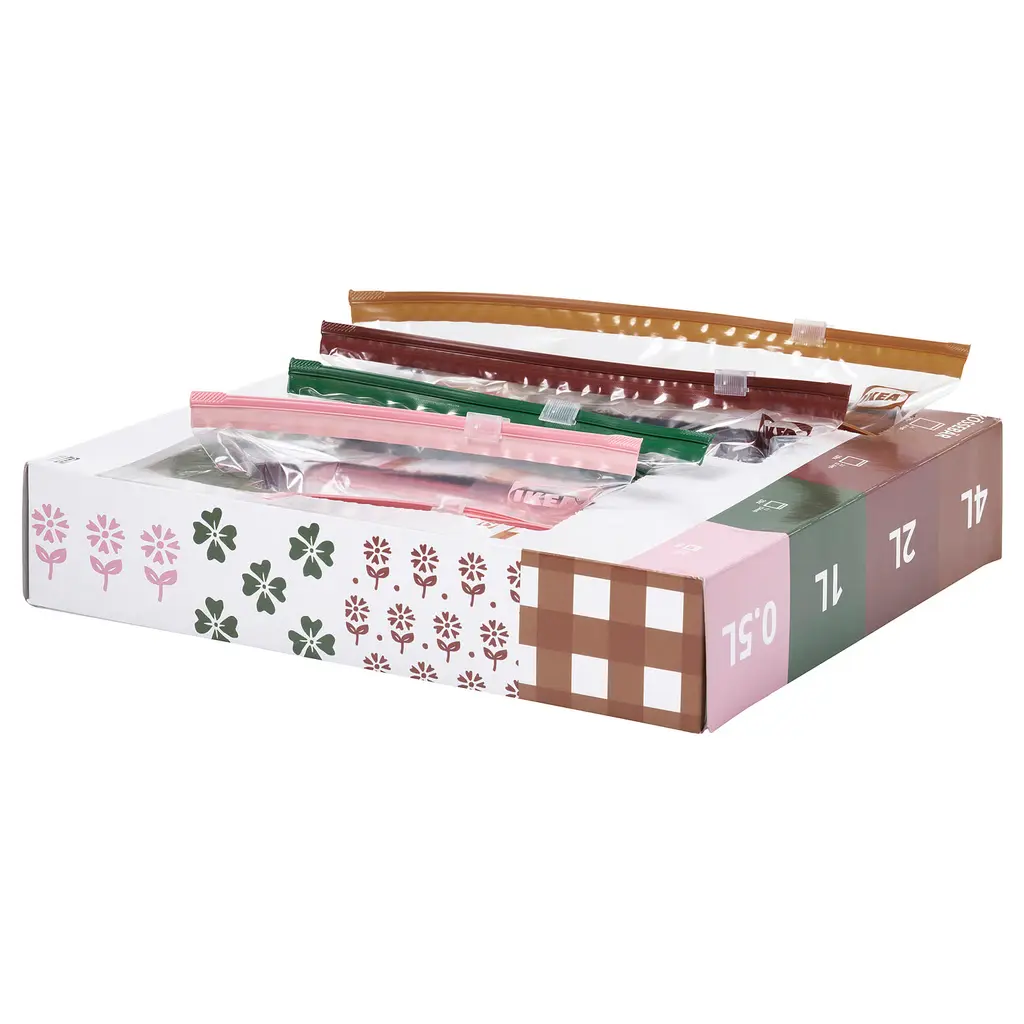 KÖSSEBÄR Resealable bag - mixed patterns. The bags in 4 different sizes have a practical resealable lock that is easy to open and close. Easy to fill since the bags have a gusseted bottom that allows them to stand up. Can be washed by hand and reused. Part of the KÖSSEBÄR collection.