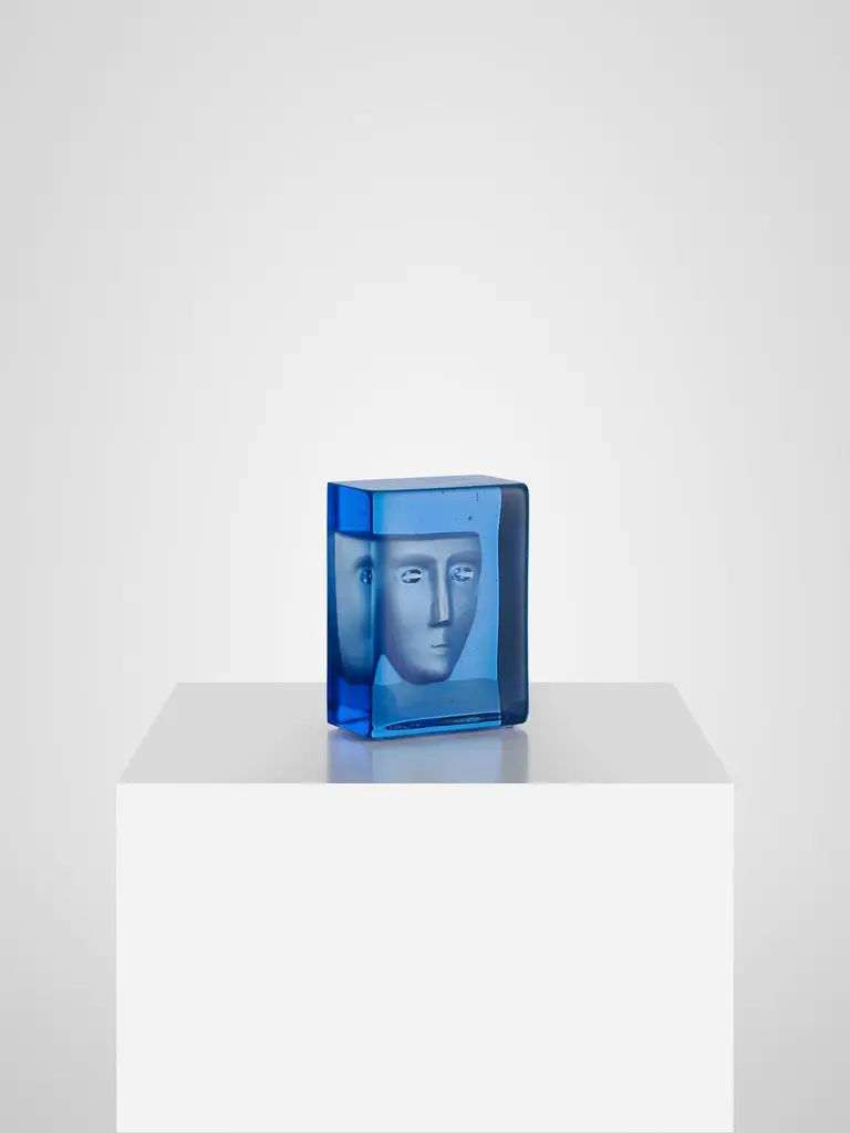 The renowned Swedish glass artist Bertil Vallien has created Azur Frost. It is an exclusive art object in blue glass, cast in a charcoal mold, with a sandblasted imprint of a face. The face is a recurring Bertil Vallien motif – one of his signatures, often seen in his magnificent boats of glass. The object is handmade at Kosta Glassworks in Sweden, in a limited edition of 1000 pieces, and is part of the Kosta Boda Artist Collection.