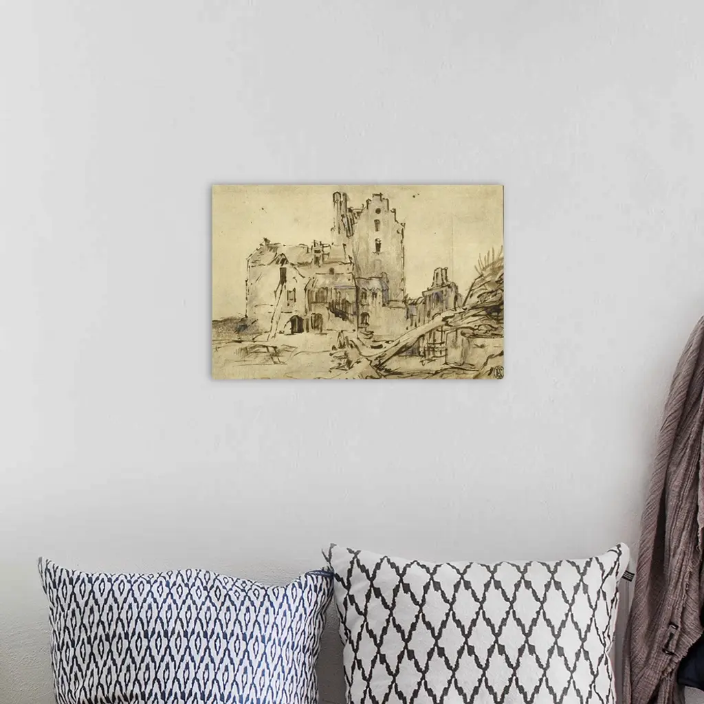 Kostverloren Castle in Decay, 1652-57, pen and brown ink, with brush and brown wash, heightened with touches of white gouache, on cream laid paper.
