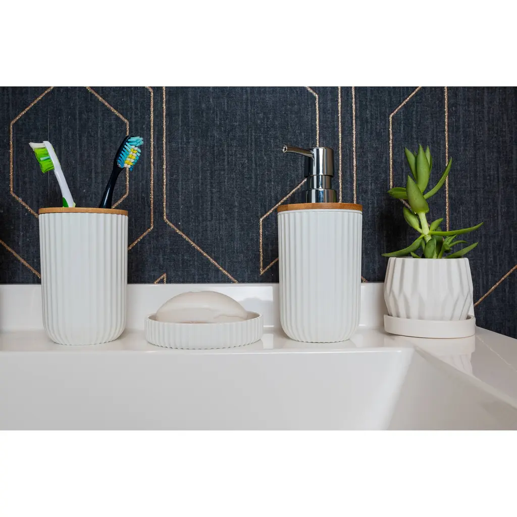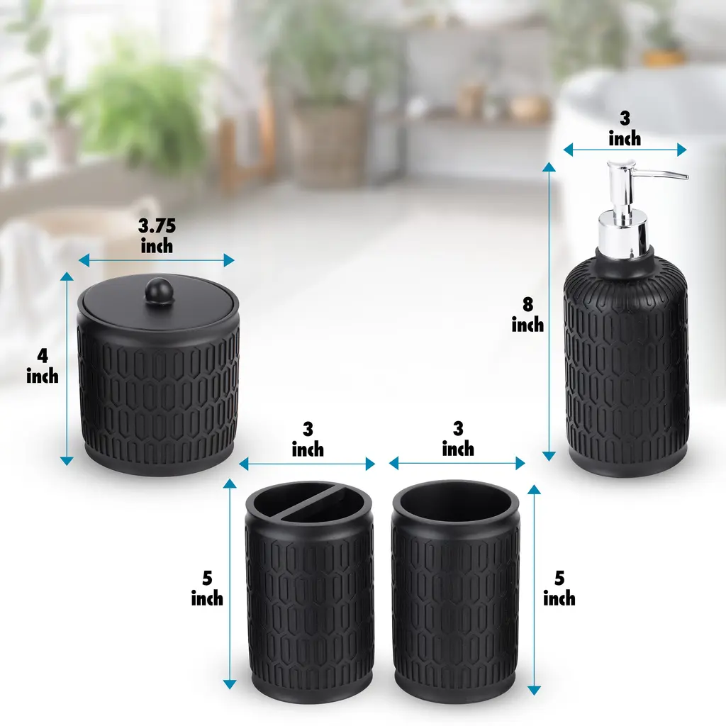 HIGH-QUALITY BAMBOO AND THICK PLASTIC | RESISTANT, DURABLE, & SHATTERPROOF: With high-quality bamboo, thick shatterproof plastic, and a coat of heavy resin, our bathroom set is durable. While extremely enduring, our bathroom set does not compromise on its surprising lightweight and versatility!, UNIQUE BAMBOO/RESIN BLENDED DESIGN: With a unique combination of bamboo and sleek modern plastic, this beautiful set can elegantly blend into any bathroom setting, bringing a whole new level of style and class.UNIQUE BAMBOO/RESIN BLENDED DESIGN: With a unique combination of bamboo and sleek modern plastic, this beautiful set can elegantly blend into any bathroom setting, bringing a whole new level of style and class. COMPLETE 4-PIECE BATHROOM SET: Without needing to make separate purchases, this four accessory assortment conveniently completes your entire bathroom set! Bathroom accessories includes: soap dispenser, soap holder, toothbrush holder and cup. EASY TO ASSEMBLE AND CLEAN: It is extremely simple to assemble our bathroom set and because of it's sleek, and high-quality materials, cleaning it is easy and quick.