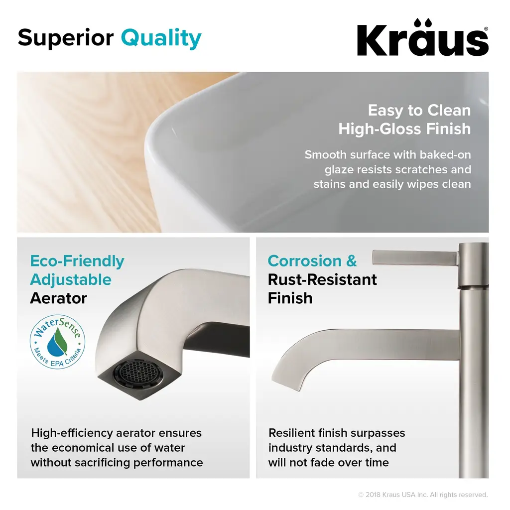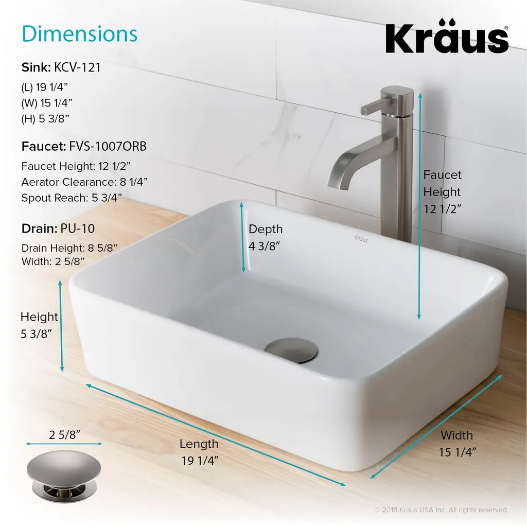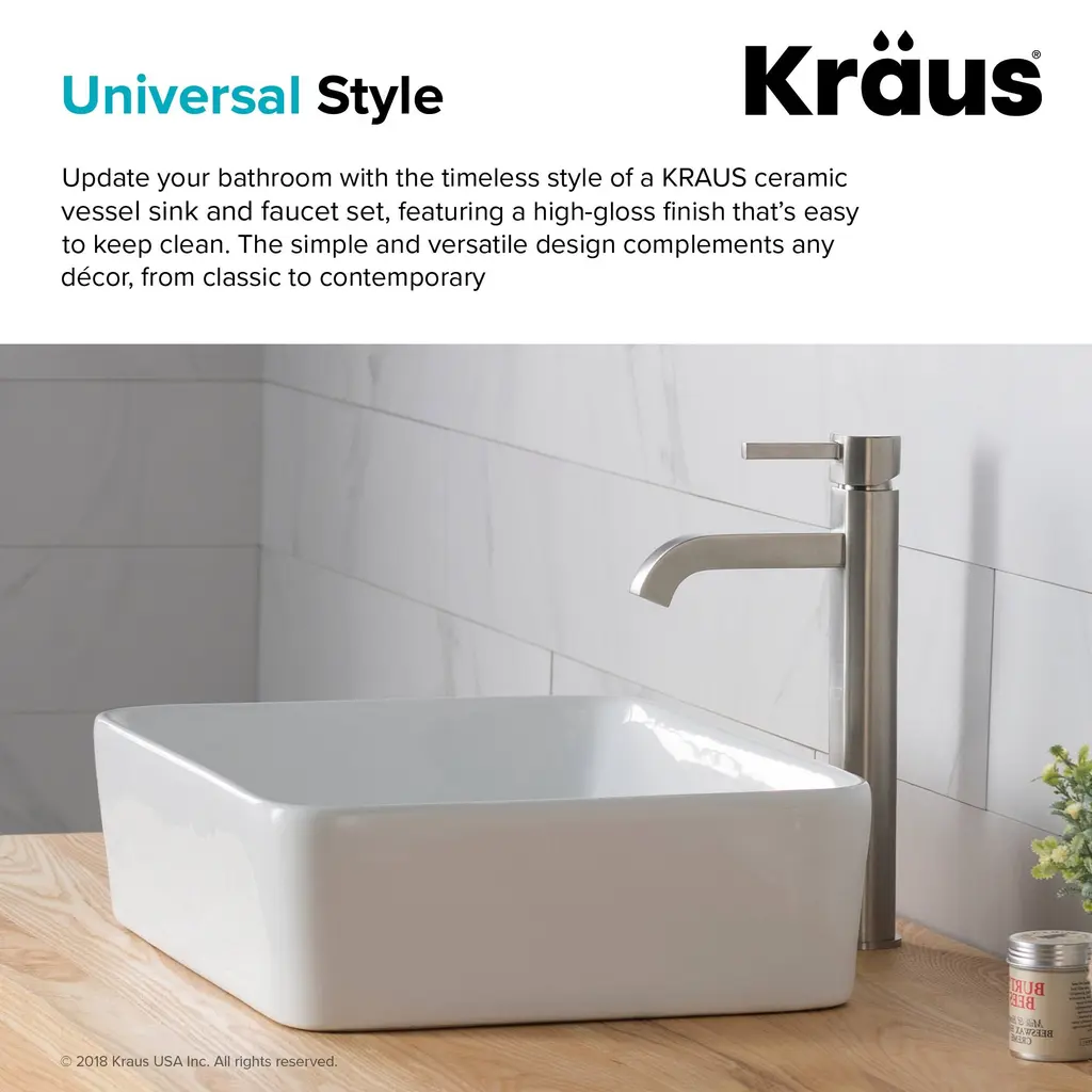 Kraus offers a fresh take on the classic ceramic sink with this contemporary bathroom combination that complements both transitional and modern bathroom decor.KRAUS KCV-121 Elavo Rectangular White Porcelain Ceramic Vessel Bathroom Sink. This elegant vessel sink has a streamlined shape that makes the bathroom counter easier to clean and de-clutter. The durable non-porous finish is scratch-resistant and easy to clean.Features KCV-121:Specifications and Warranty KCV-121:KRAUS FVS-1007 Ramus 12 1/2 inch Tall Vessel Bathroom Faucet. Launch a fresh look with the architectural-style detailing of this bathroom vessel sink faucet. Features Ramus FVS-1007:Specifications and Warranty FVS-1007:KRAUS KVF-1220 Ramus 12 7/8-inch Tall Single Handle Vessel Bathroom Faucet with Pop Up Drain. Kraus Ramus collection. Comes with lift rod drain and pre-attached water lines for easy installation with any topmount or undermount sinks.Features Ramus KVF-1220: Specifications and Warranty KVF-1220: NOTE: Each sink may have a 3% dimension tolerance. Please measure the sink prior to installation.