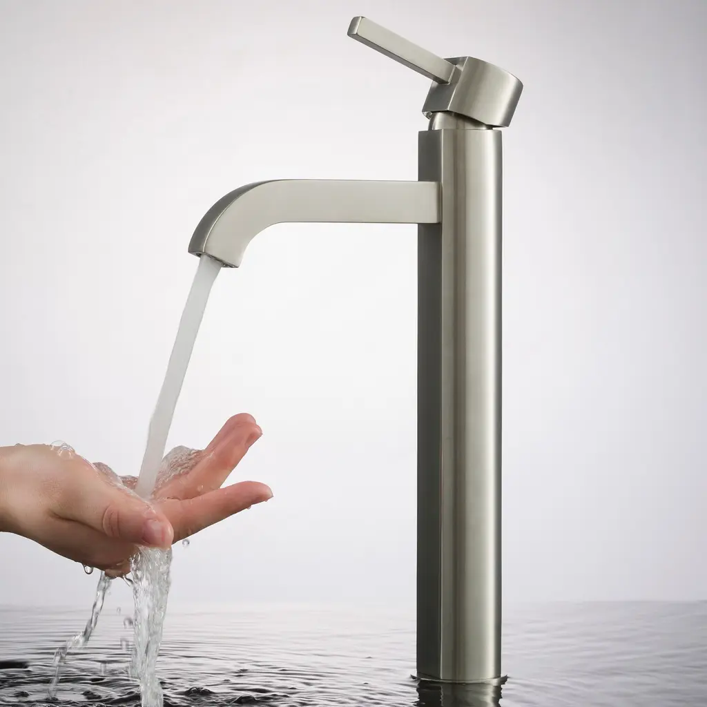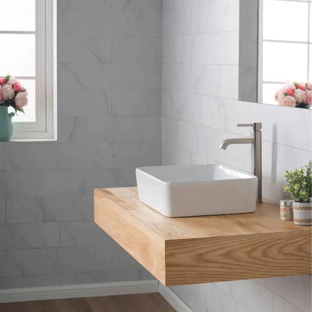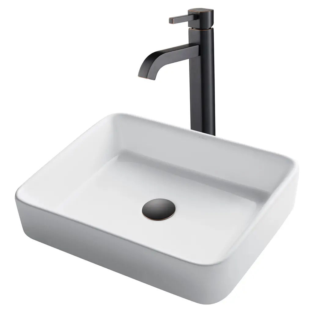 Kraus offers a fresh take on the classic ceramic sink with this contemporary bathroom combination that complements both transitional and modern bathroom decor.KRAUS KCV-121 Elavo Rectangular White Porcelain Ceramic Vessel Bathroom Sink. This elegant vessel sink has a streamlined shape that makes the bathroom counter easier to clean and de-clutter. The durable non-porous finish is scratch-resistant and easy to clean.Features KCV-121:Specifications and Warranty KCV-121:KRAUS FVS-1007 Ramus 12 1/2 inch Tall Vessel Bathroom Faucet. Launch a fresh look with the architectural-style detailing of this bathroom vessel sink faucet. Features Ramus FVS-1007:Specifications and Warranty FVS-1007:KRAUS KVF-1220 Ramus 12 7/8-inch Tall Single Handle Vessel Bathroom Faucet with Pop Up Drain. Kraus Ramus collection. Comes with lift rod drain and pre-attached water lines for easy installation with any topmount or undermount sinks.Features Ramus KVF-1220: Specifications and Warranty KVF-1220: NOTE: Each sink may have a 3% dimension tolerance. Please measure the sink prior to installation.
