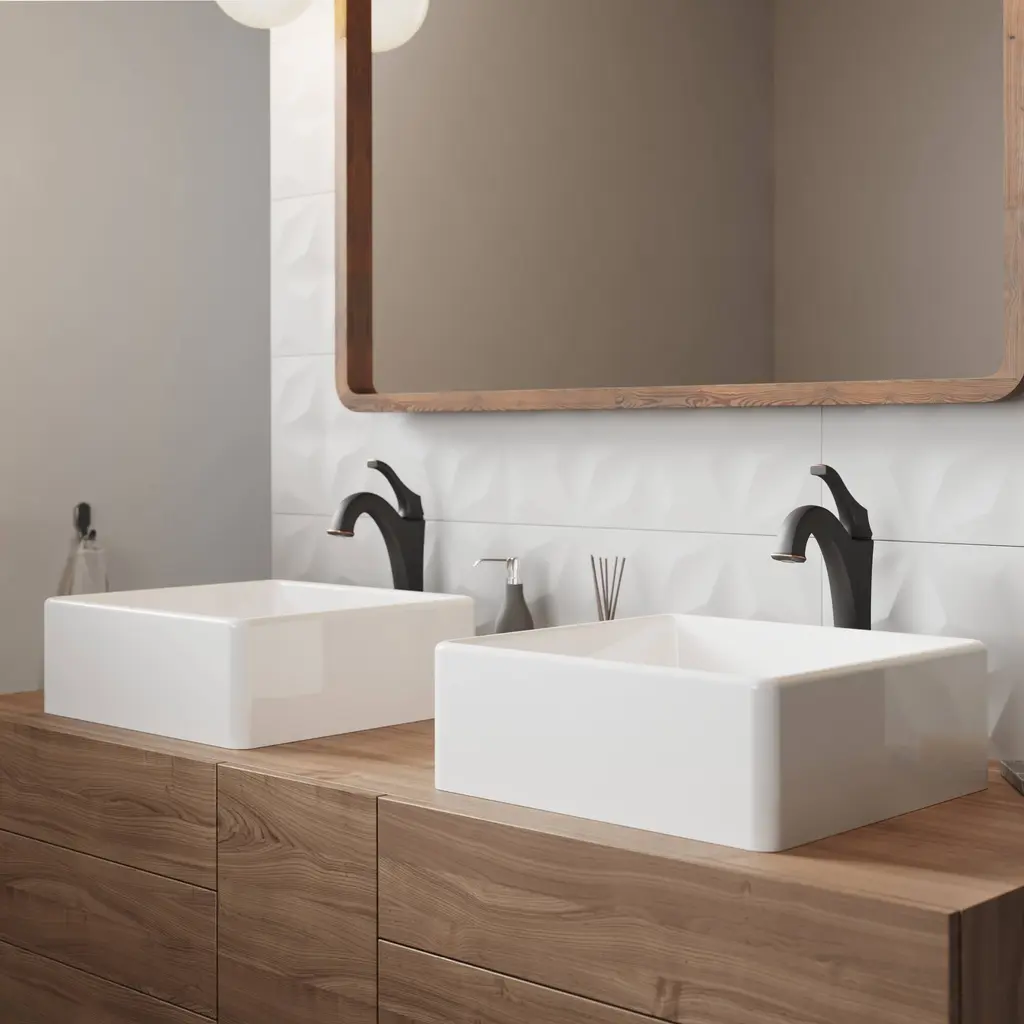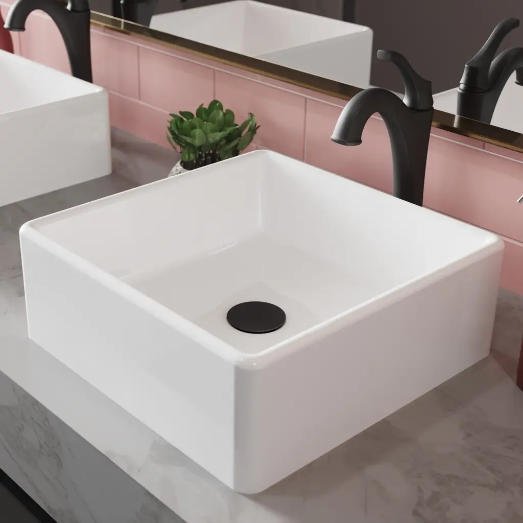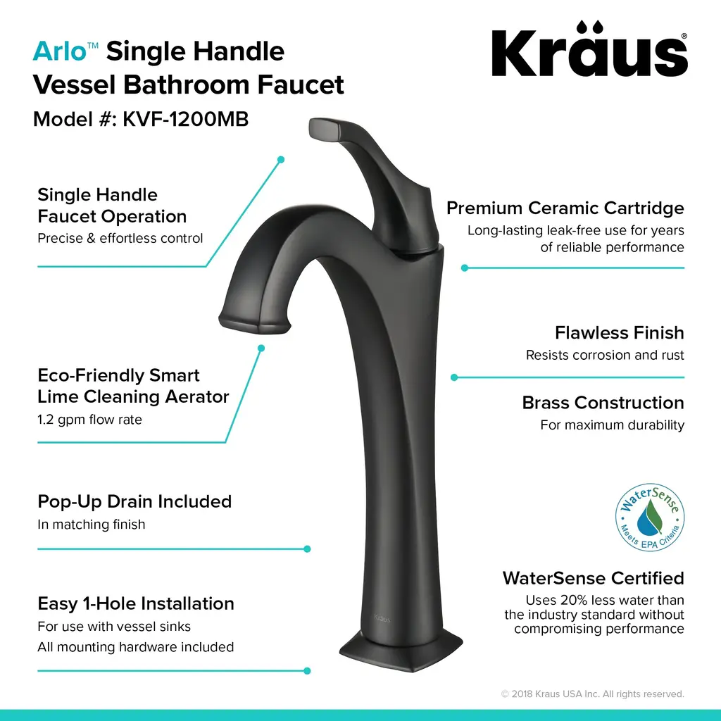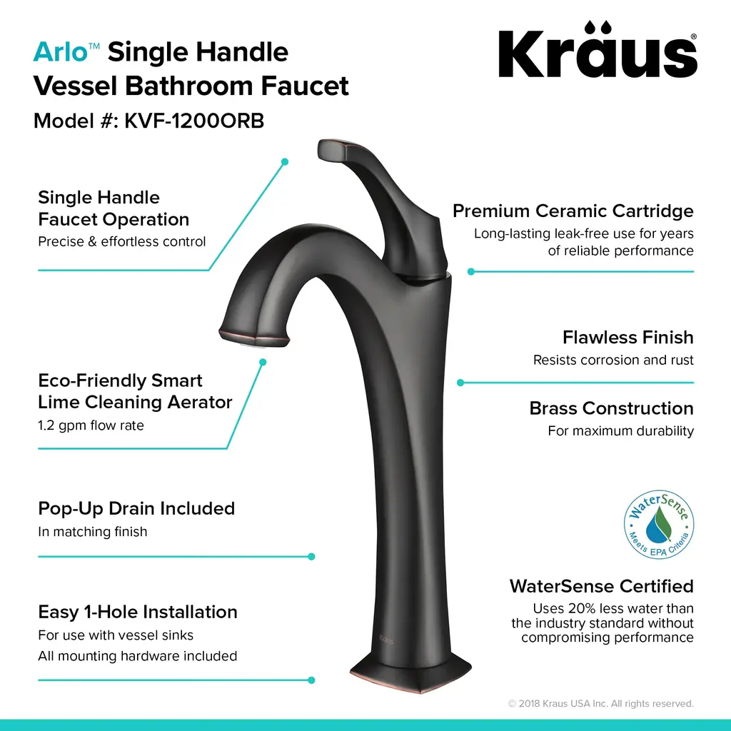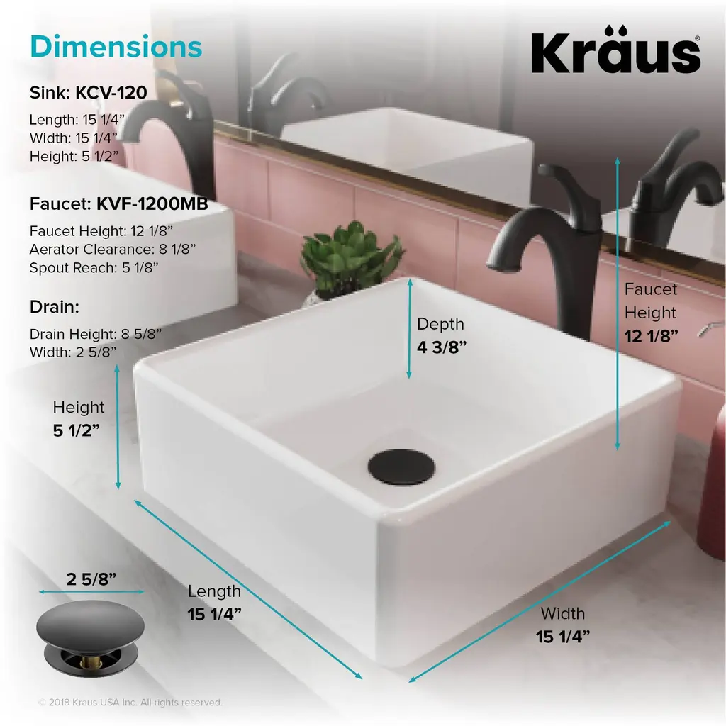 Refresh your bathroom with the KRAUS vessel sink and faucet set, featuring an Elavo ceramic sink paired with an elegant Arlo faucet. Clean lines and a gracefully arched spout create a beautiful finishing touch that will enhance the look of any bath.KRAUS KCV-120 Elavo Square White Porcelain Ceramic Vessel Bathroom Sink. The Elavo Series offers a fresh look for classic white ceramic. This elegant vessel sink has a streamlined shape that makes the bathroom counter easier to clean and de-clutter. The durable non-porous finish is scratch-resistant and easy to clean.Features:Collection:Specifications and Warranty:KRAUS KVF-1200 Arlo 12 1/8 inch Tall Single Handle Vessel Bathroom Faucet with Pop Up Drain. Upgrade your bathroom with this elegantly arched faucet. This single-hole faucet is elongated height makes it an ideal complement for vessel sinks, while its lever-style handle makes it easy to use with full or wet hands.Features KVF-1200: Finishes: Specifications KVF-1200: NOTE: Each sink may have a 3% dimension tolerance. Please measure the sink prior to installation.
