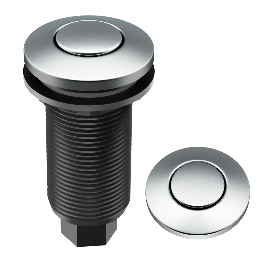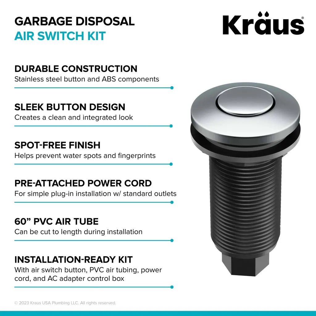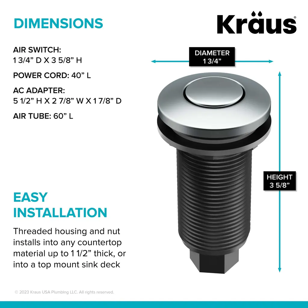The KRAUS Garbage Disposal Air Switch Kit is a sleek and functional alternative to traditional wall-mount toggle switches, allowing you to activate your garbage disposal with the push of a button while creating a coordinated look with your kitchen faucet. The air switch mounts to your countertop or sink deck to simplify installation and make it easy to use your disposal. Universal design is compatible with most garbage disposals, offering a worry-free alternative to an electrical switch.Features Air Switch Kit KWDA-100 and KWDA-200: Listing Options: Flat-Top Air Switch Button KWDB-20: This Garbage Disposal Air Switch Button has a universal design that works with all KRAUS Air Switch Kits and garbage disposals. It is also compatible with most other air-activated switches and garbage disposal brands on the market. A functional alternative to traditional wall-mount switches, it allows you to activate your disposal with the push of a button. This replacement button comes in a choice of finish options that allow you to coordinate with your kitchen faucet. The streamlined flat-top design creates a clean and integrated look. The extra-long threaded housing can be installed into countertops up to 1 1/2" thick, or into a top mount sink deck with standard 1 1/4" soap dispenser accessory hole. Durable stainless steel and ABS construction helps ensure long-lasting operation. Overall dimensions: 1 7/8" D x 3 1/2" H. One year warranty.