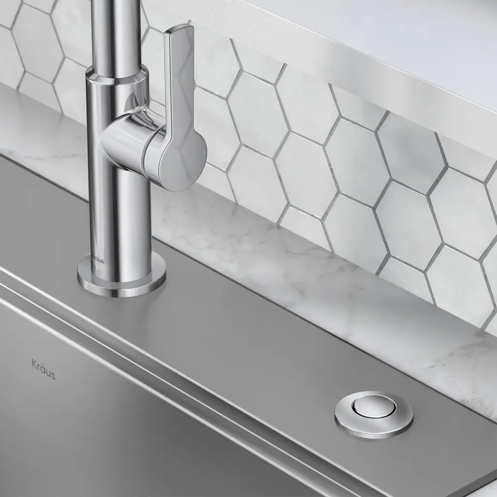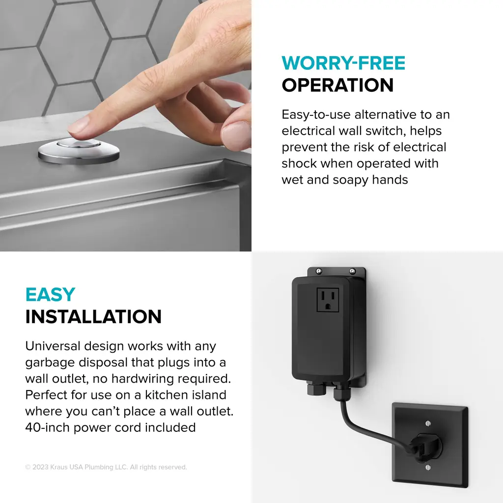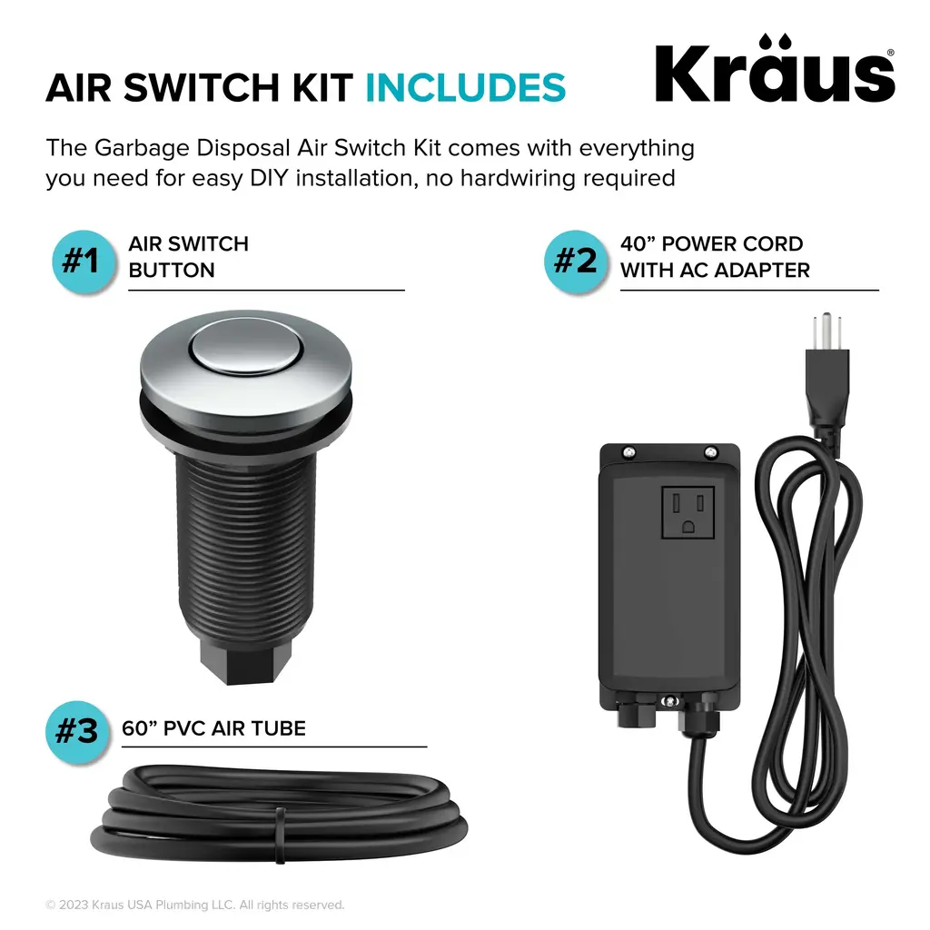 The KRAUS Garbage Disposal Air Switch Kit is a sleek and functional alternative to traditional wall-mount toggle switches, allowing you to activate your garbage disposal with the push of a button while creating a coordinated look with your kitchen faucet. The air switch mounts to your countertop or sink deck to simplify installation and make it easy to use your disposal. Universal design is compatible with most garbage disposals, offering a worry-free alternative to an electrical switch.Features Air Switch Kit KWDA-100 and KWDA-200: Listing Options: Flat-Top Air Switch Button KWDB-20: This Garbage Disposal Air Switch Button has a universal design that works with all KRAUS Air Switch Kits and garbage disposals. It is also compatible with most other air-activated switches and garbage disposal brands on the market. A functional alternative to traditional wall-mount switches, it allows you to activate your disposal with the push of a button. This replacement button comes in a choice of finish options that allow you to coordinate with your kitchen faucet. The streamlined flat-top design creates a clean and integrated look. The extra-long threaded housing can be installed into countertops up to 1 1/2" thick, or into a top mount sink deck with standard 1 1/4" soap dispenser accessory hole. Durable stainless steel and ABS construction helps ensure long-lasting operation. Overall dimensions: 1 7/8" D x 3 1/2" H. One year warranty.
