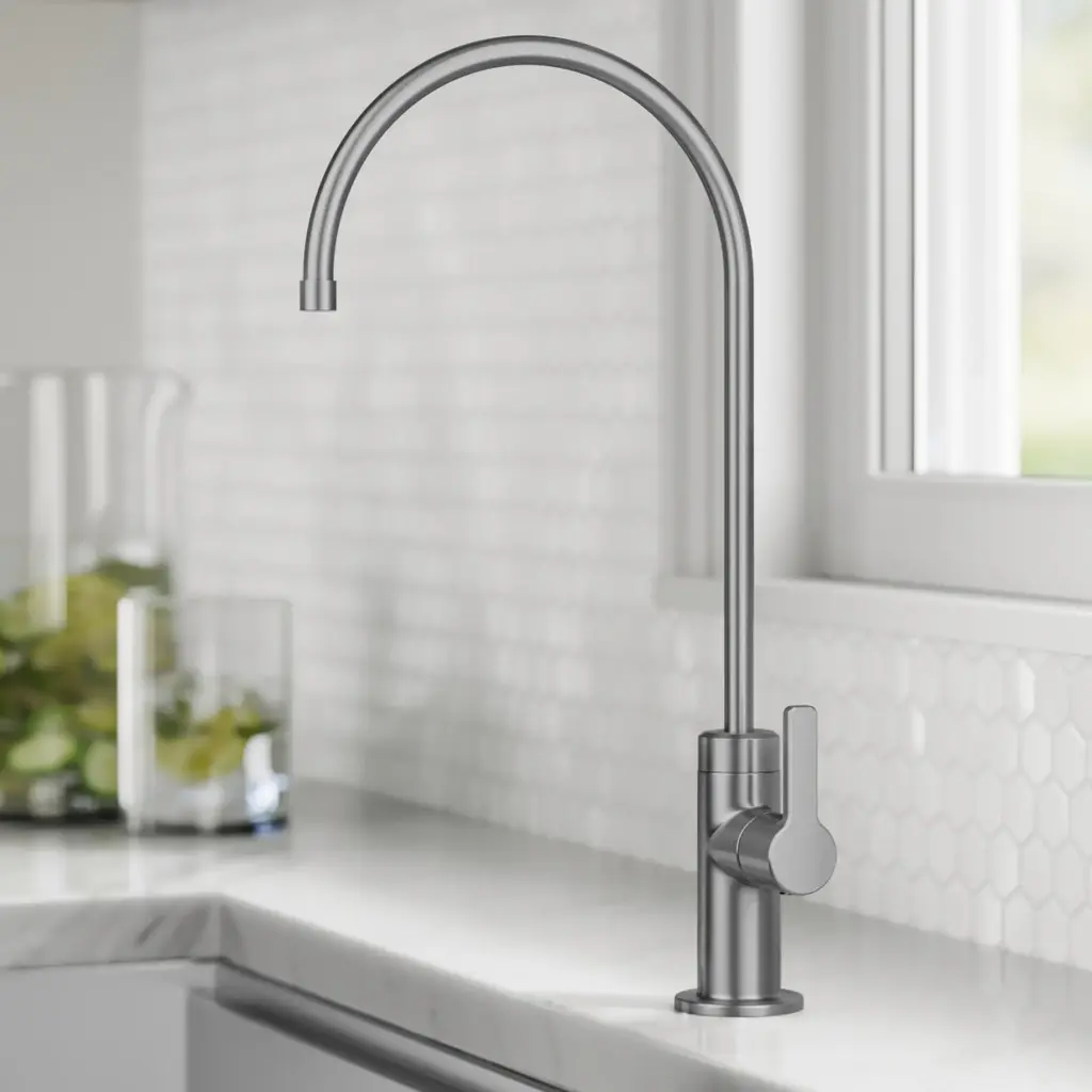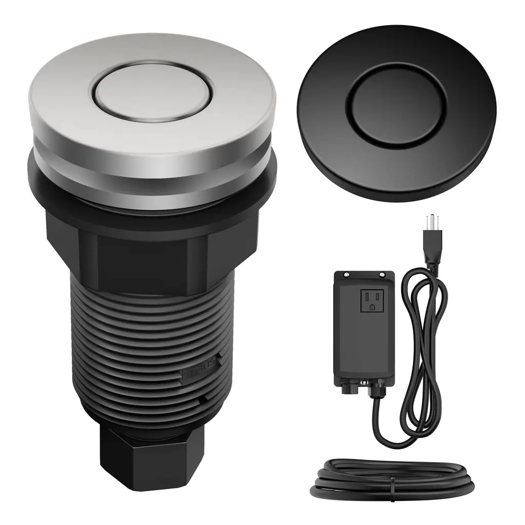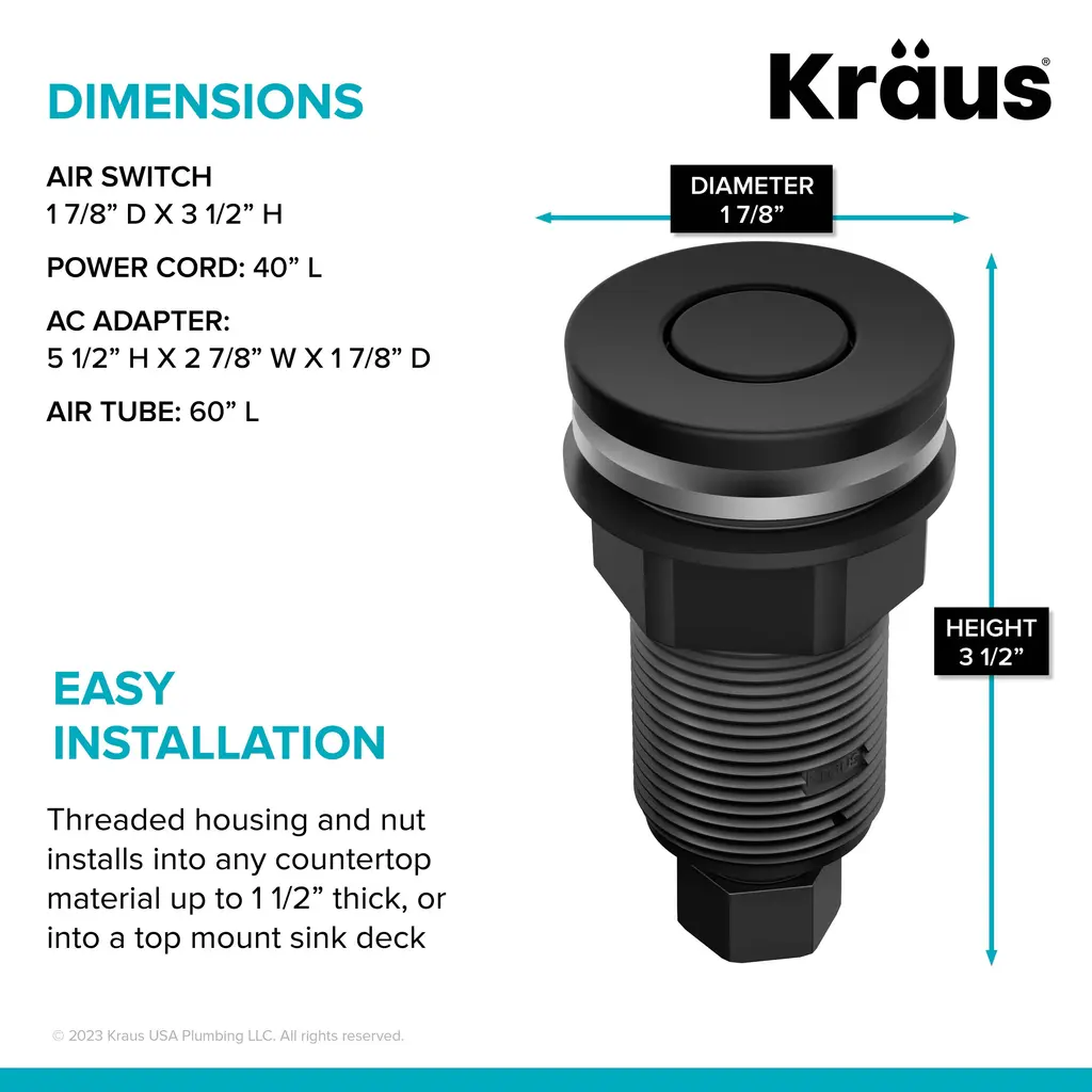 The KRAUS Garbage Disposal Air Switch Kit is a sleek and functional alternative to traditional wall-mount toggle switches, allowing you to activate your garbage disposal with the push of a button while creating a coordinated look with your kitchen faucet. The air switch mounts to your countertop or sink deck to simplify installation and make it easy to use your disposal. Universal design is compatible with most garbage disposals, offering a worry-free alternative to an electrical switch.Features Air Switch Kit KWDA-100 and KWDA-200: Listing Options: Flat-Top Air Switch Button KWDB-20: This Garbage Disposal Air Switch Button has a universal design that works with all KRAUS Air Switch Kits and garbage disposals. It is also compatible with most other air-activated switches and garbage disposal brands on the market. A functional alternative to traditional wall-mount switches, it allows you to activate your disposal with the push of a button. This replacement button comes in a choice of finish options that allow you to coordinate with your kitchen faucet. The streamlined flat-top design creates a clean and integrated look. The extra-long threaded housing can be installed into countertops up to 1 1/2" thick, or into a top mount sink deck with standard 1 1/4" soap dispenser accessory hole. Durable stainless steel and ABS construction helps ensure long-lasting operation. Overall dimensions: 1 7/8" D x 3 1/2" H. One year warranty.