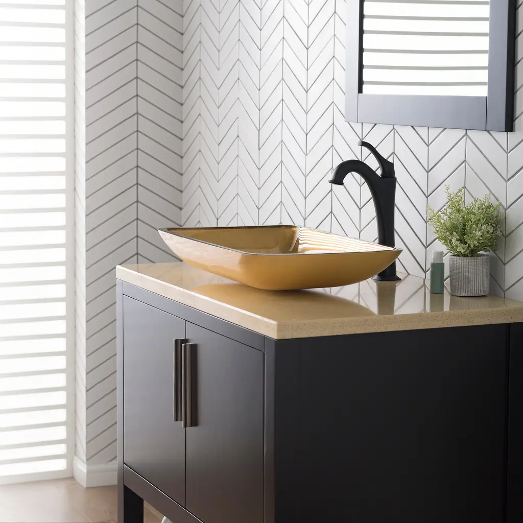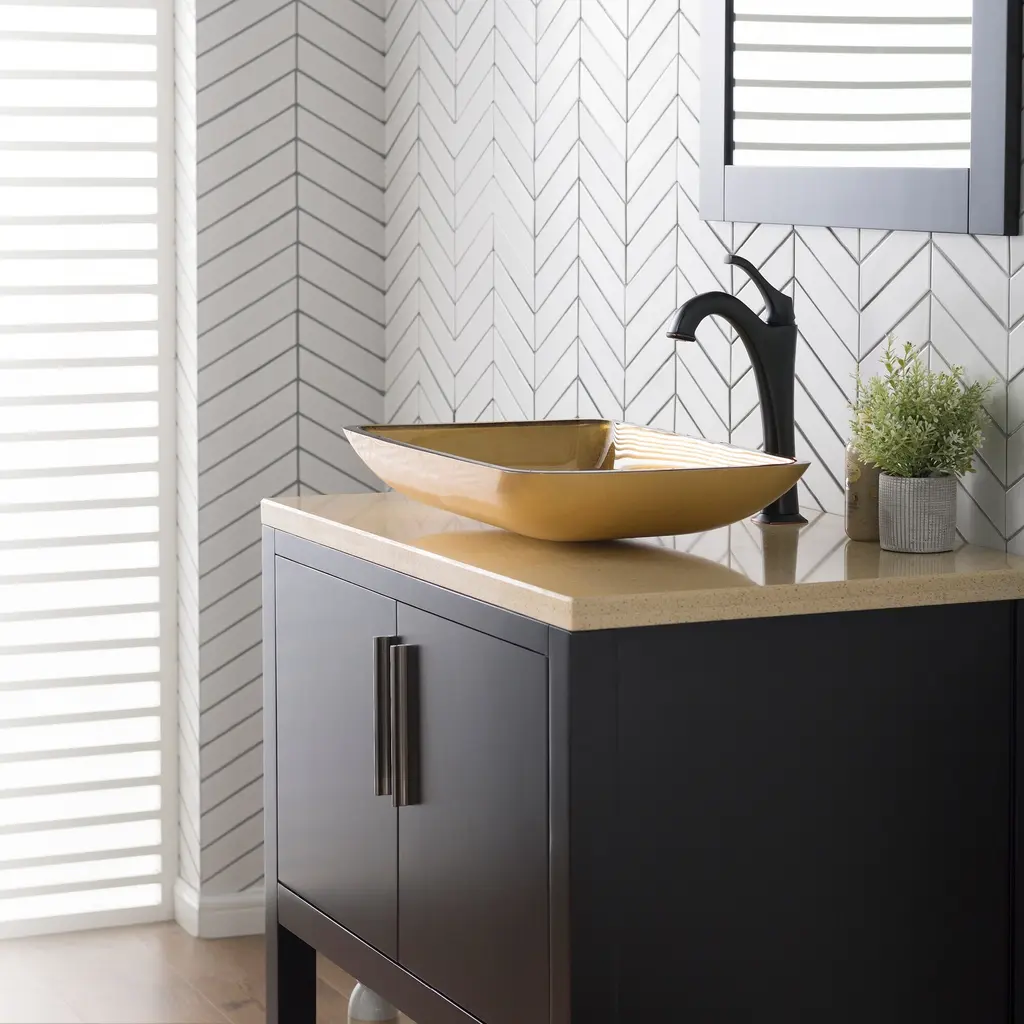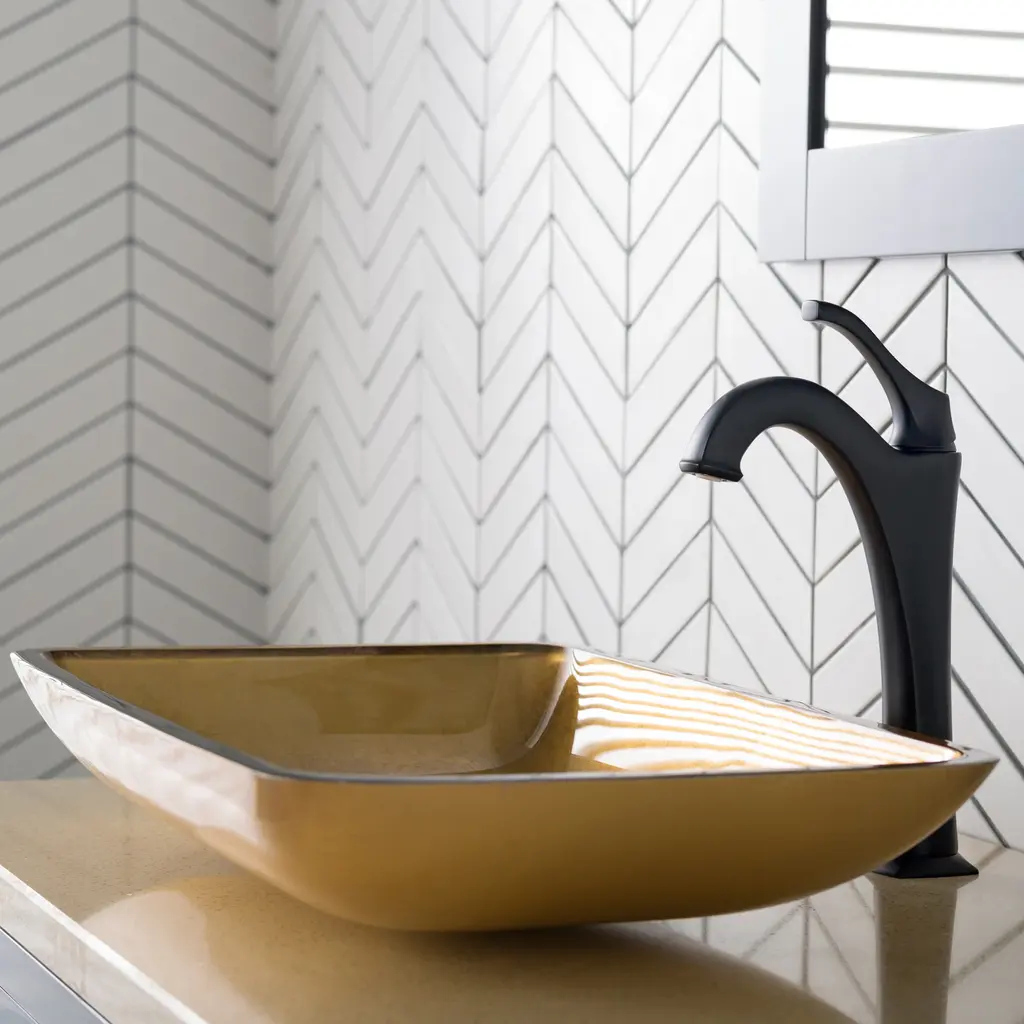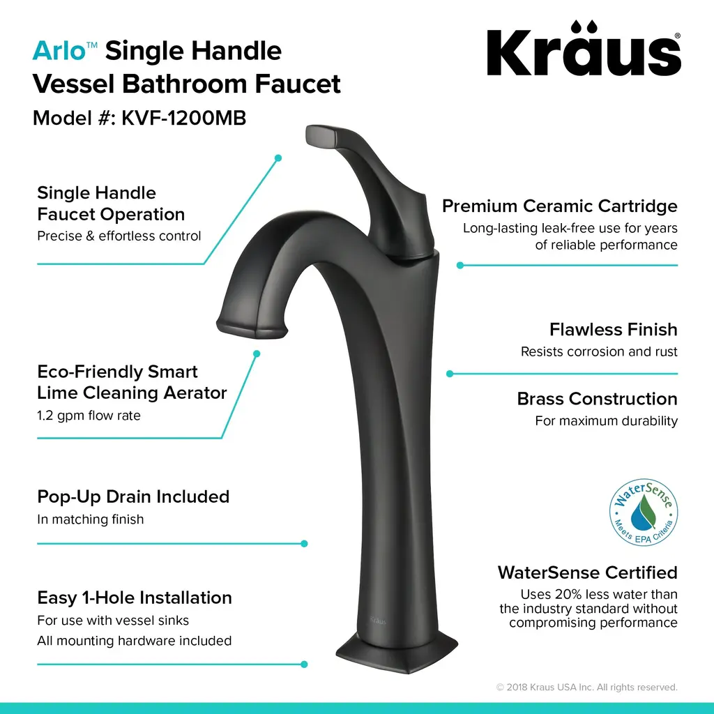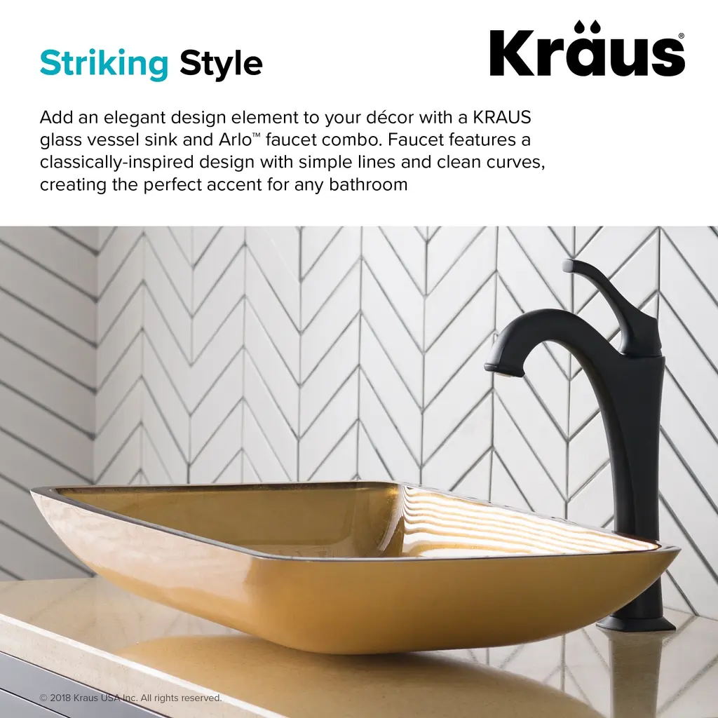 Add a touch of color to your bathroom with a Kraus glass vessel sink. Handcrafted from tempered glass, this modern bathroom sink coordinates with a variety of decor styles. A freestanding basin design creates a dramatic look with contemporary appeal. Vessel installation offers an easy top mount option for all your stylish bathroom ideas. The textured surface of the sink is dynamic and requires minimal maintenance to keep clean. Pair this sink with any single hole vessel faucet for a beautifully coordinated look. The handcrafted nature of this product will produce minor differences in design and sizing. Subtle variations will occur from piece to piece, adding to its unique qualities. Measurements may vary slightly.KRAUS KVF-1200 Arlo 12 1/8 inch Tall Single Handle Vessel Bathroom Faucet with Pop Up Drain. Upgrade your bathroom with this elegantly arched faucet. This single-hole faucet is elongated height makes it an ideal complement for vessel sinks, while its lever-style handle makes it easy to use with full or wet hands. The spot-free finish keeps this faucet looking bright, while its water-saving design offers eco-friendly operation.