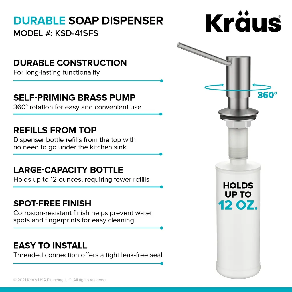 Self-priming solid brass soap dispenser with large-capacity bottle refills from above the counter with no need to go underneath the kitchen sink. The universal design complements any kitchen decor style and features a threaded connection for easy installation and a heavy-duty pump that rotates 360 degrees for complete sink access.