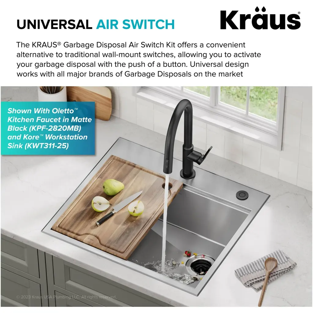 The KRAUS garbage disposal air switch kit offers a sleek and functional alternative to traditional wall-mount switches, allowing you to activate your garbage disposal with the push of a button while creating a coordinated look with your kitchen faucet. The air switch mounts to your countertop or sink deck, simplifying installation and making it easy to use your disposal. By eliminating the need for a dedicated wall switch, this device helps ensure that there is no live electricity at countertop level, offering a worry-free alternative to an electrical switch that helps prevent the risk of shock if operated with wet and soapy hands. Threaded housing can be installed into countertops up to 1 1/2” thick, or into a top mount sink deck with standard 1 1/4” soap dispenser accessory hole. Durable stainless steel construction and ABS components help ensure lasting operation. Universal design works with most disposals on the market, including the KRAUS WasteGuard garbage disposal. Ideal for use on a kitchen island where it is not possible to place a traditional wall outlet to power a garbage disposal. The flat-top button creates a clean and integrated look that will complement your kitchen decor. Kit includes air switch button, PVC air tubing, power cord, and AC adapter for easy DIY installation. Kits ordered in Brushed Brass, Matte Black, and Spot Free Antique Champagne Bronze come with spare air switch button in Spot Free Stainless Steel.Kraus KWDA-200 Features:Kraus KWDA-200 Specifications: