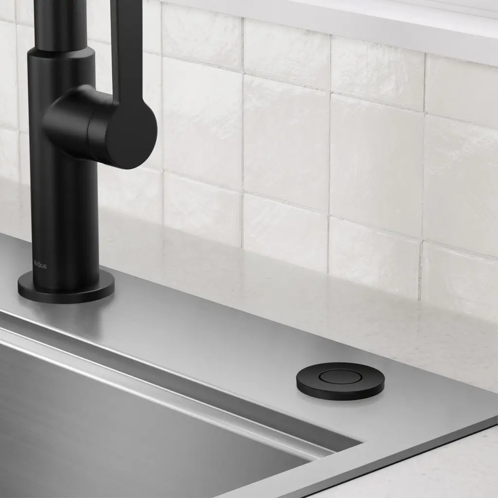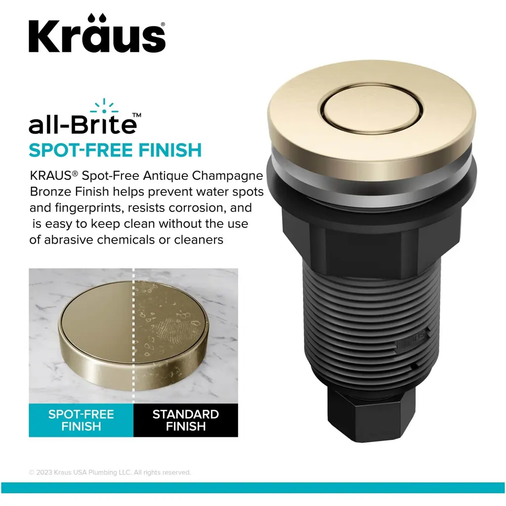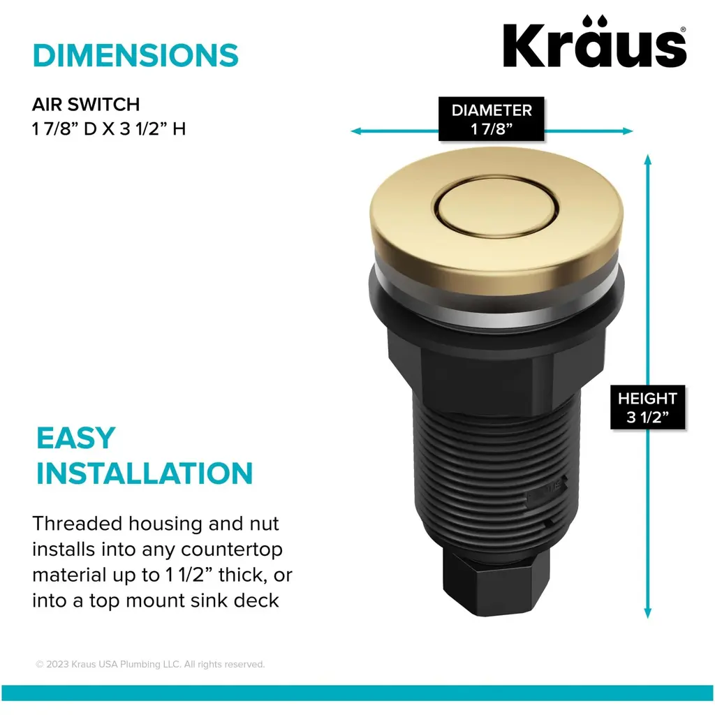 This garbage disposal air switch button has a universal design that works with all KRAUS air switch kits and garbage disposals. It's also compatible with most other air-activated switches and garbage disposal brands on the market. A functional alternative to traditional wall-mount switches, it allows you to activate your disposal with the push of a button. This replacement button comes in a choice of finish options that allow you to coordinate with your kitchen faucet, including finishes that resist water spots and fingerprints for easy cleaning. The streamlined flat-top design creates a clean and integrated look. The extra-long threaded housing can be installed into countertops up to 1 1/2” thick, or into a top mount sink deck with standard 1 1/4” soap dispenser accessory hole. Durable stainless steel and ABS construction helps ensure long-lasting operation. This air switch button is ideal for use on a kitchen island where it is not possible to place a traditional wall outlet to power a garbage disposal. Package includes air switch button ONLY – compatible with Kraus air switch kits.Kraus KWDB-20 Features:Kraus KWDB-20 Specifications: