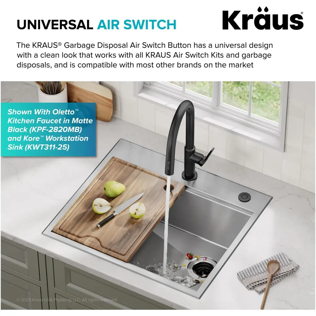 This garbage disposal air switch button has a universal design that works with all KRAUS air switch kits and garbage disposals. It's also compatible with most other air-activated switches and garbage disposal brands on the market. A functional alternative to traditional wall-mount switches, it allows you to activate your disposal with the push of a button. This replacement button comes in a choice of finish options that allow you to coordinate with your kitchen faucet, including finishes that resist water spots and fingerprints for easy cleaning. The streamlined flat-top design creates a clean and integrated look. The extra-long threaded housing can be installed into countertops up to 1 1/2” thick, or into a top mount sink deck with standard 1 1/4” soap dispenser accessory hole. Durable stainless steel and ABS construction helps ensure long-lasting operation. This air switch button is ideal for use on a kitchen island where it is not possible to place a traditional wall outlet to power a garbage disposal. Package includes air switch button ONLY – compatible with Kraus air switch kits.Kraus KWDB-20 Features:Kraus KWDB-20 Specifications: