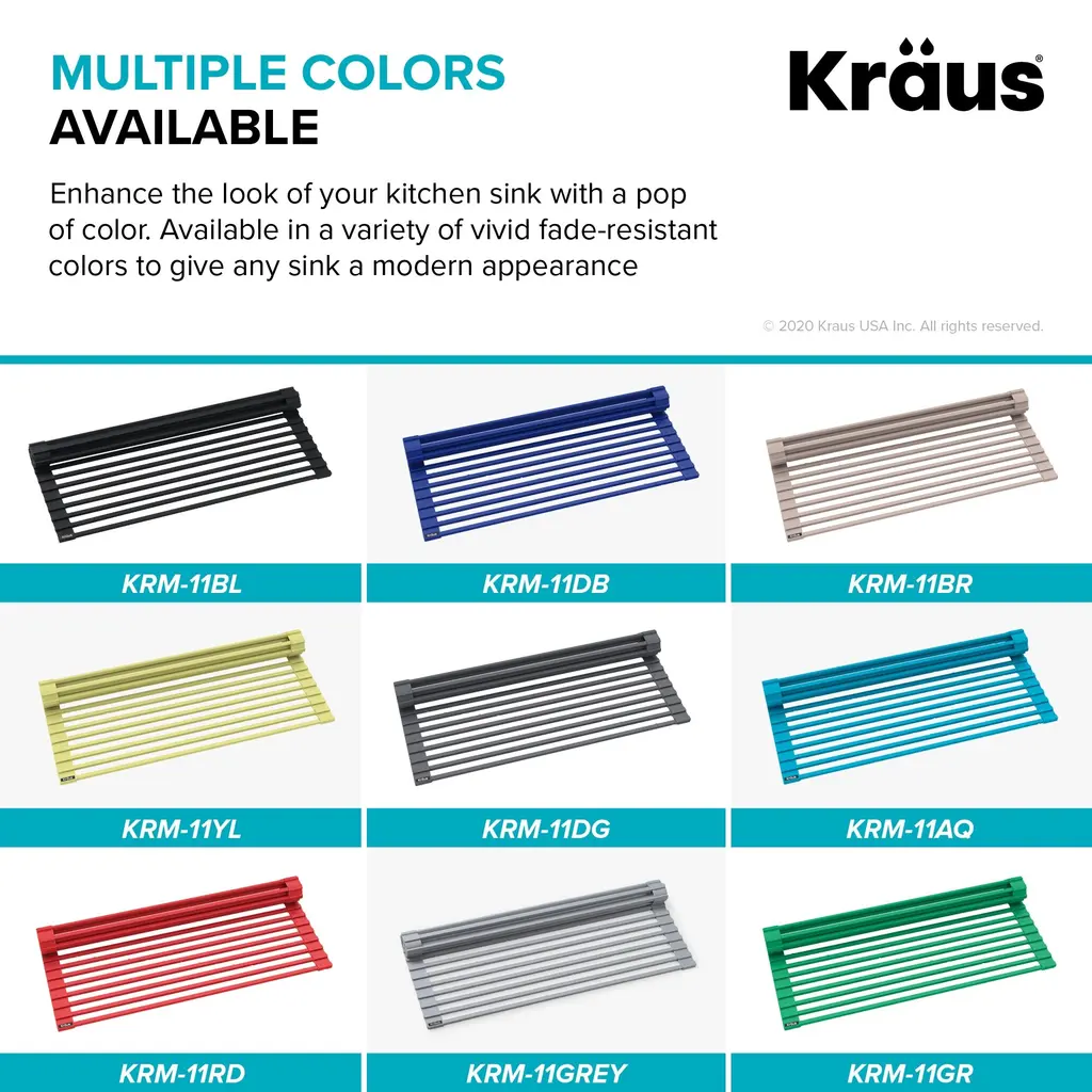 KRAUS KRM-11 Multipurpose Workstation Sink Roll-Up Dish Drying Rack. Perhaps the most all-around versatile kitchen accessory, the KRAUS Multi-Purpose Roll-Up Dish Drying Rack is the Swiss Army knife of the kitchen, helping with everything from food prep to clean-up. Designed to sit securely on the built-in ledge of your Workstation Sink, this drying rack allows you to wash produce and dry dishes while keeping the watery mess over the sink and off of your kitchen counters. Ideal for rinsing fruits and veggies the convenient over-the-sink design prevents dripping on your countertop. The universal design fits all standard-sized kitchen sinks and helps you keep countertops free of clutter by making use of the space over your sink. Generous dimensions make this roll-up rack a great tool for drying large items, like baking sheets and oversized cutting boards, that can't fit or should not be dried in a dishwasher. Heat-safe up to 400 degrees F, you can use it as a trivet to protect your kitchen counters and tabletops from hot pots and pans straight out of the oven, or use it directly in the oven for tasks like roasting and braising. The sturdy stainless steel construction with food-safe silicone coating can hold your heaviest cookware with a weight capacity of 85 lbs. This roll up dish rack is dishwasher-safe and easy to clean. Multiple colors are available to match your kitchen sink Features: