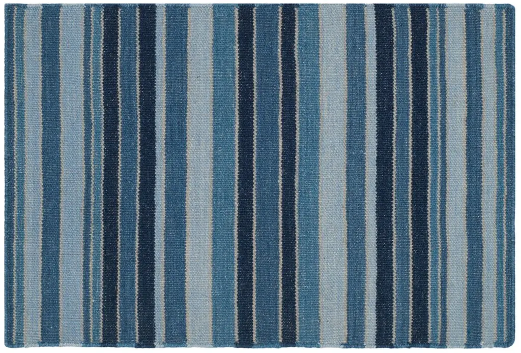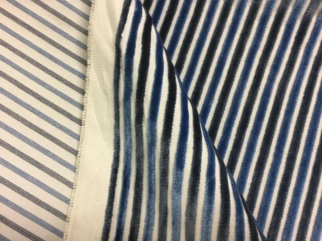 54" wide Kravet Ennobled Royal 30339-5 Barclay Butera cut velvet chenille stripe upholstery fabric in navy, blue, and off white. Price is per yard. Composition: 82% Viscose, 18% Cotton