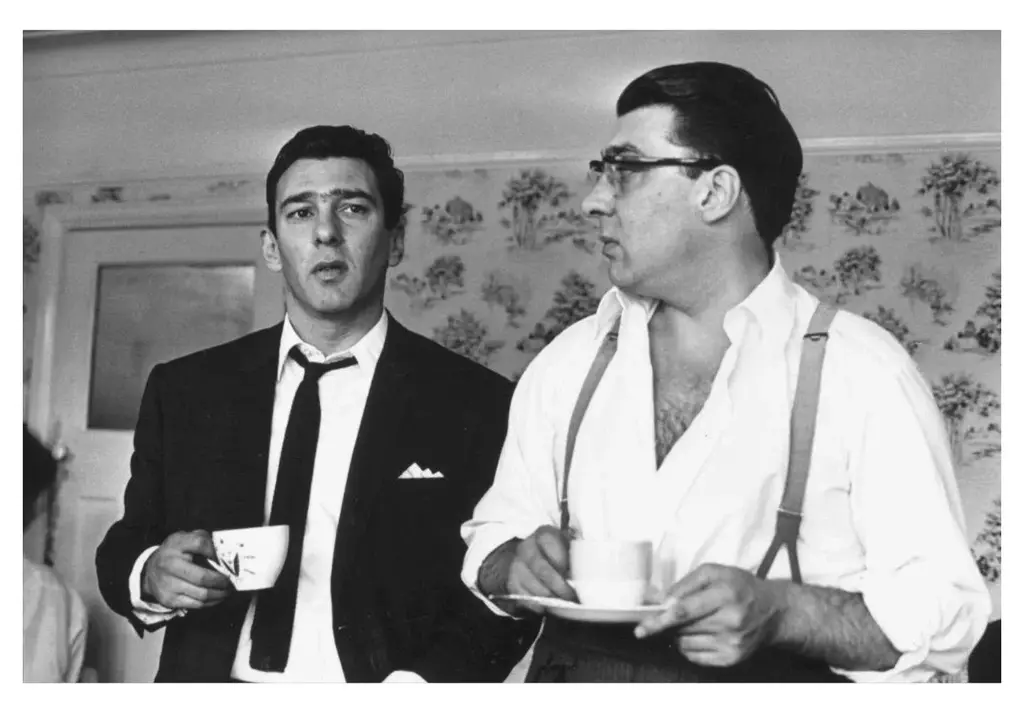 Kray Brothers London gangsters Ronnie and Reggie Kray at home having a cup of tea. They had just spent 36 hours being questioned by the police about the murder of George Cornell. (Photo by William Lovelace/Daily Express/Hulton Archive/Getty Images) Archival Pigment Print Paper size: 12 x 16" inches / 30 x 40 cm Approx framed size : 19 x 23" inches / 48 x 58 cm Framed in brown solid wood frame with a mount and glazing - ready to hang .