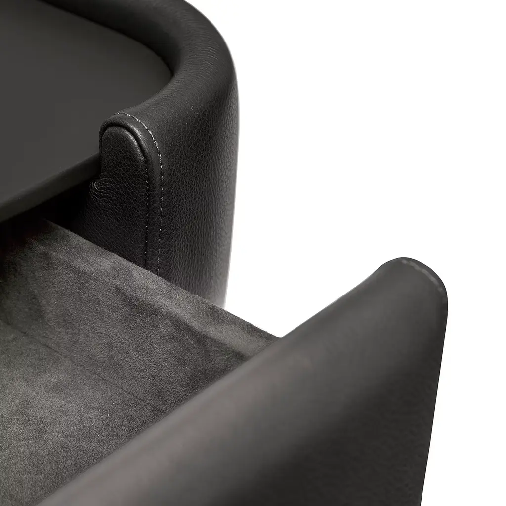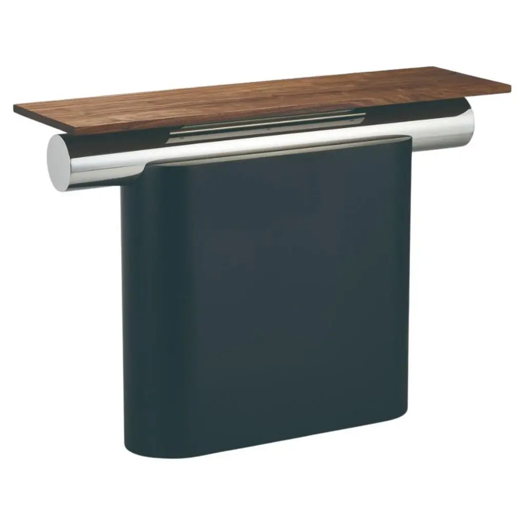 Elegant in its simplicity, this console will make a refined statement in a modern entryway. Distinguished by clean and essential lines enhanced with smooth curves, it features an upper structure in poplar plywood and two fabric-upholstered drawers in birch plywood, padded with polyurethane foam and upholstered with black leather. The legs are fashioned of MDF enhanced with a shiny polyester finish, elegantly contrasting the satin brass details that complete this design.