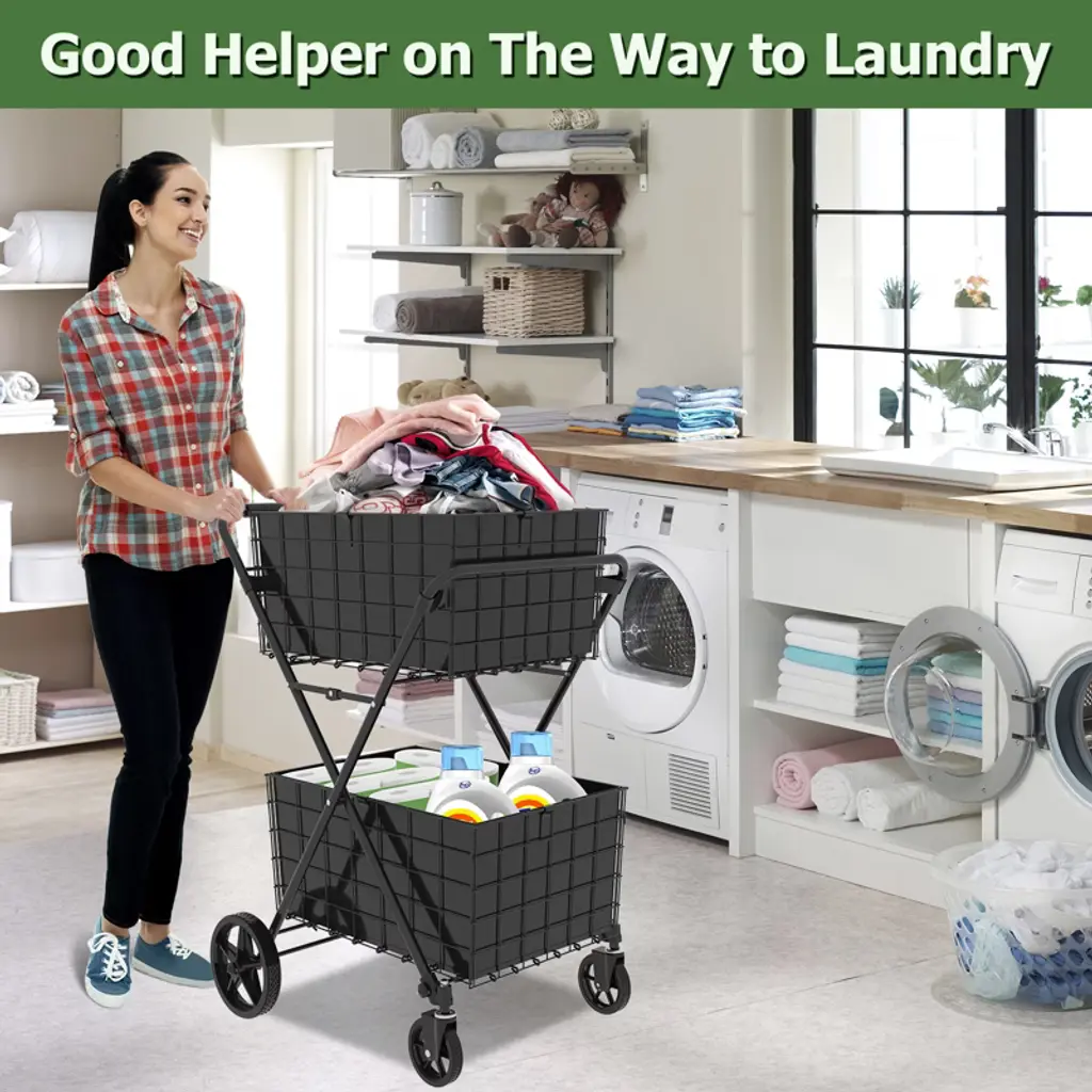 Ktmbdw 2-tier Shopping Cart For Groceries, Folding Grocery Cart, Heavy Duty Utility Carts With 2 Liners, Multi-functional Trolley For Laundry, Black
