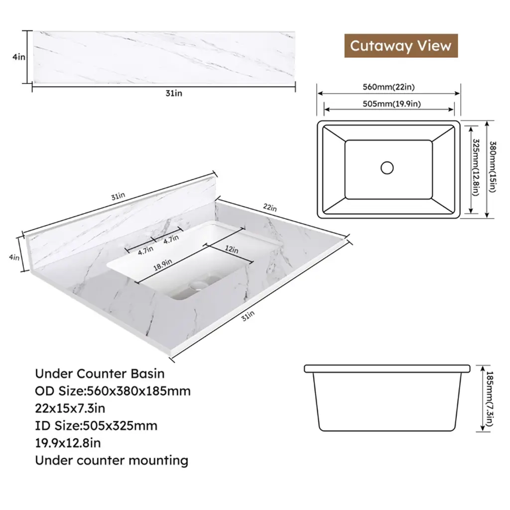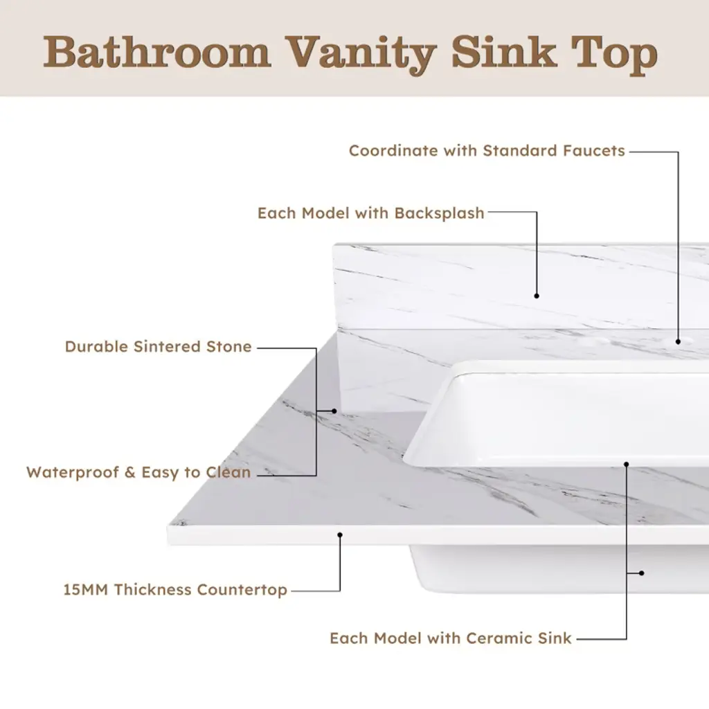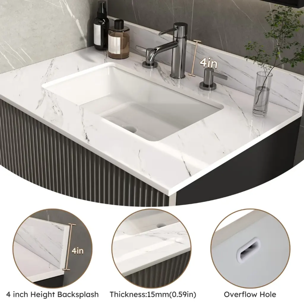 Ktmbdw 31'' Rectangular Bathroom Sink With Marble Vanity Top, 3 Predrilled Centerset And 4-inch Backsplash, Stain-resistant, Easy-to-clean- White