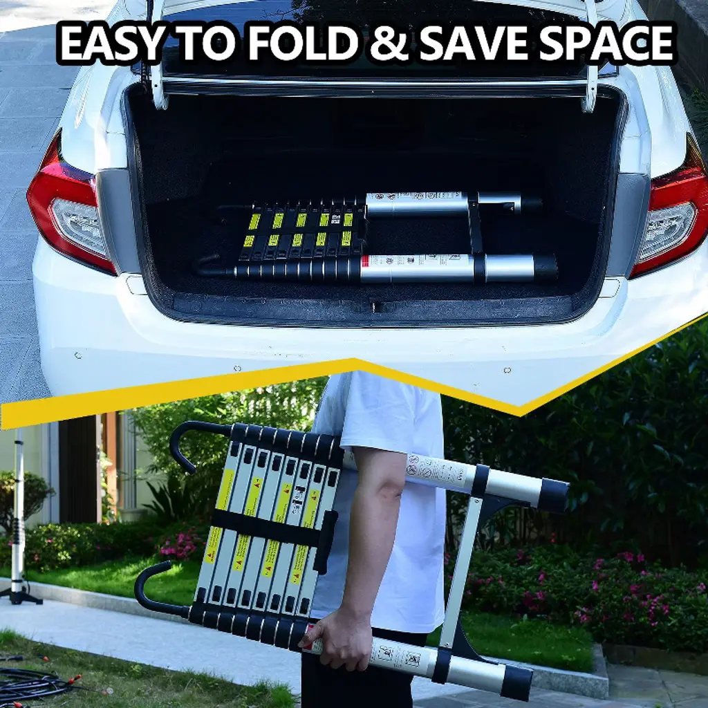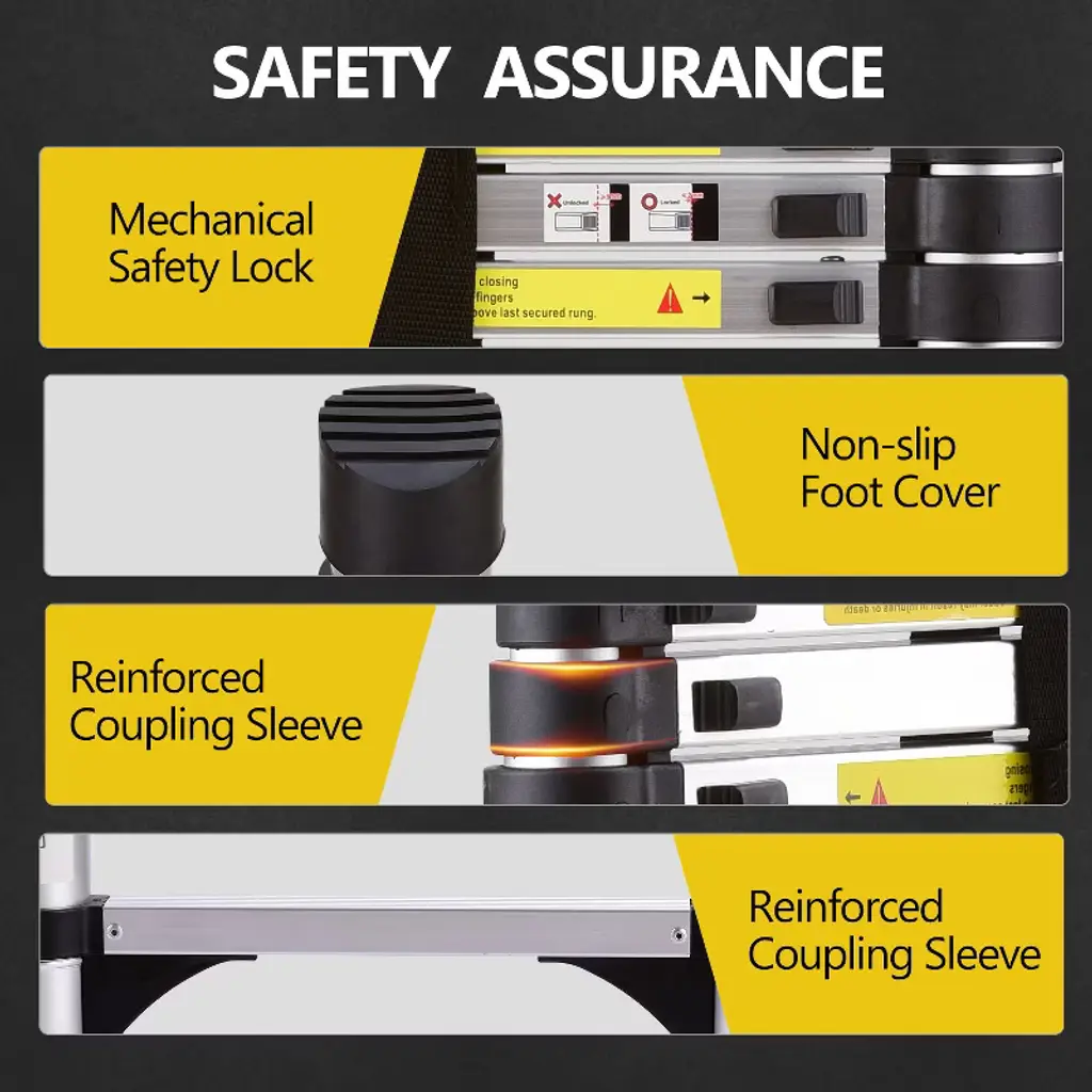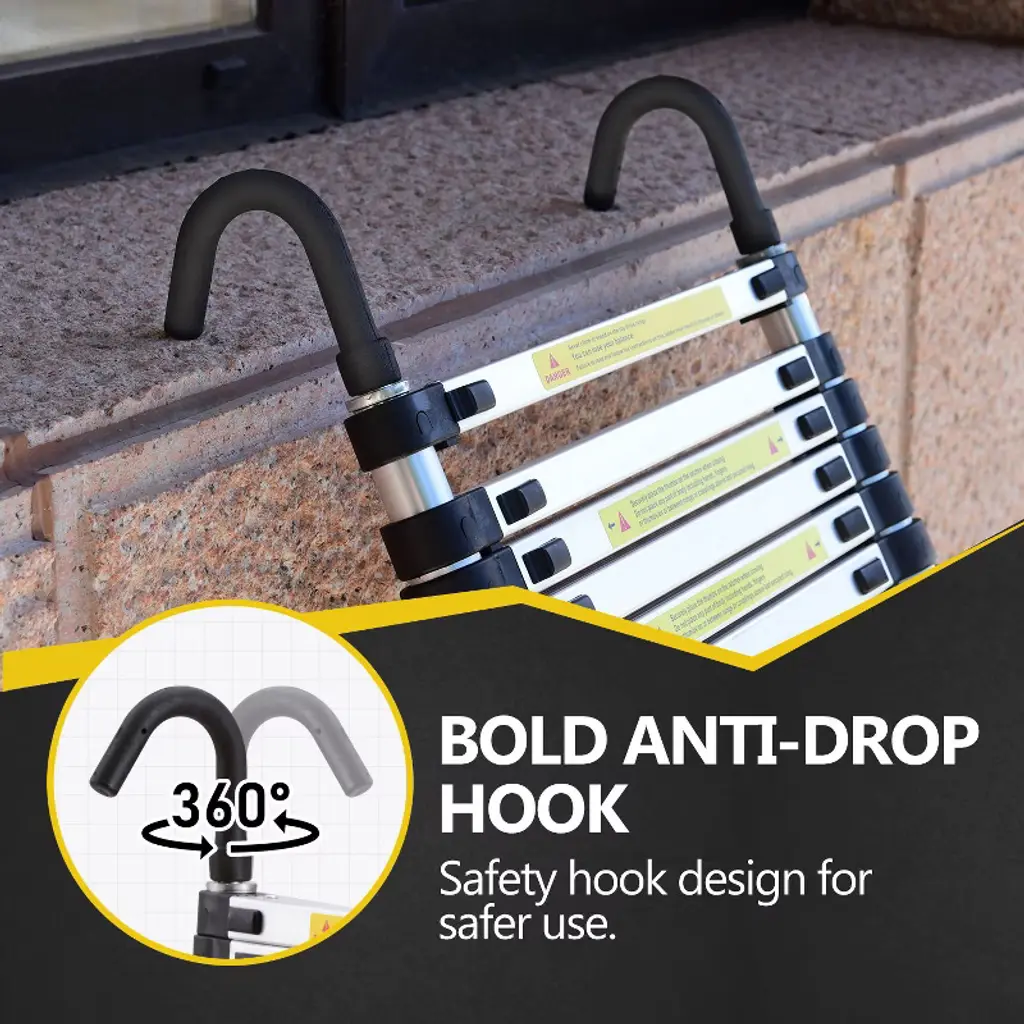 Our multi button folding telescopic ladder has two solid mechanical bolts at each step, instead of designing a one button retract button, so that even one of the buttons can not work normally, while other steps of the telescopic ladder can still remain in place without retracting, and the failure rate is very low during use. Its anti-skid and wear-resistant rubber feet always keep the ladder firmly fixed on the ground, providing you with double safety.